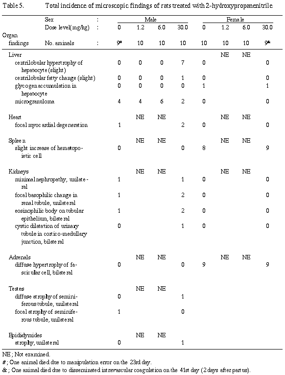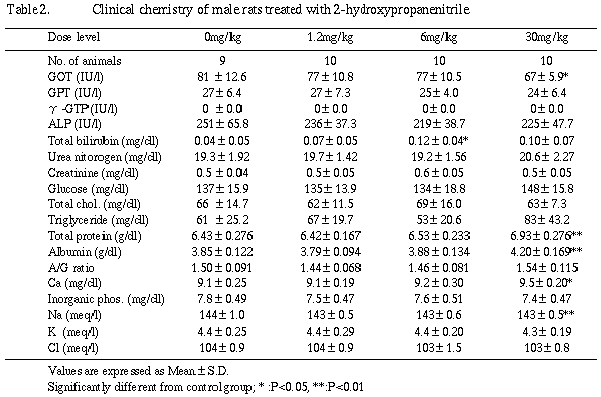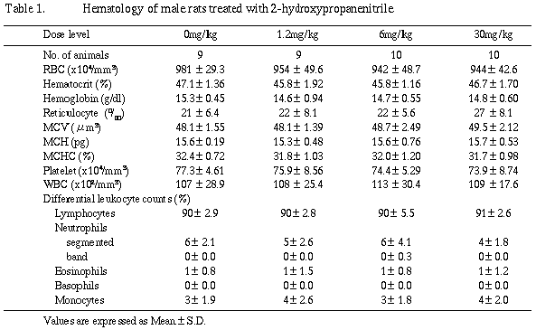 nitrileの主な代謝部位は肝臓と考えられていることから1-4)、今回認められた肝細胞の脂肪化は、被験物質の影響が肝臓での適応範囲を越えて、細胞障害が惹起されたものと推察される。しかし、肝細胞の脂肪化は小葉中心性の肝細胞肥大を示した7例中1例で、且つ軽度に認められるのみであり、さらに雄の6 mg/kg以下の群および雌では肝細胞肥大も認められなかった。また、体重、摂餌量および血液学的検査においても異常は認められなかったことから、被験物質の毒性学的影響は軽度のものと考えられる。