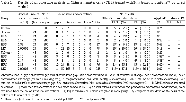 OECDを中心として行われている国際協力による安全性点検評価事業の一環として、高生産量既存化学物質で現在十分な安全性資料のない2−ヒドロキシプロパンニトリルについて、培養細胞に及ぼす細胞遺伝学的影響を評価するため、チャイニーズ・ハムスター培養細胞(CHL)を用いて試験管内染色体異常試験を実施した。