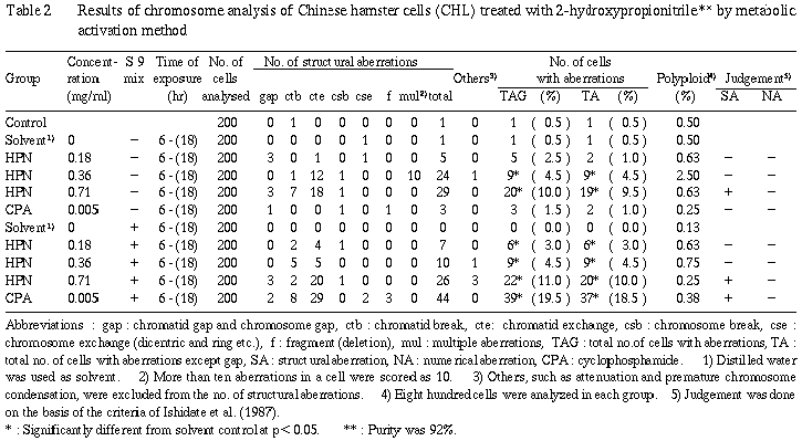2−ヒドロキシプロパンニトリルは、今回実施した試験条件下で、試験管内のCHL細胞に染色体異常を誘発すると結論した。