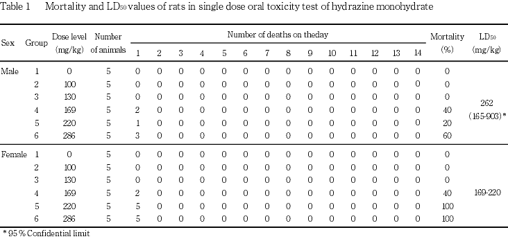 ヒドラジン一水和物の100,130,169,220および286 mg/kgを6週齢のCrj:CD(SD)IGS系ラットの雌雄に単回経口投与し,投与後14日間観察した.死亡例は雌雄とも169 mg/kg以上の投与群でいずれも観察第1日に認められた.ヒドラジン一水和物の雄におけるLD50値(95 %信頼限界)は262(165〜903)mg/kgであり,雌では169〜220 mg/kgの間にあった.