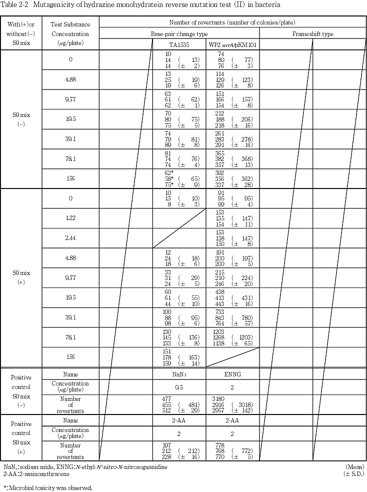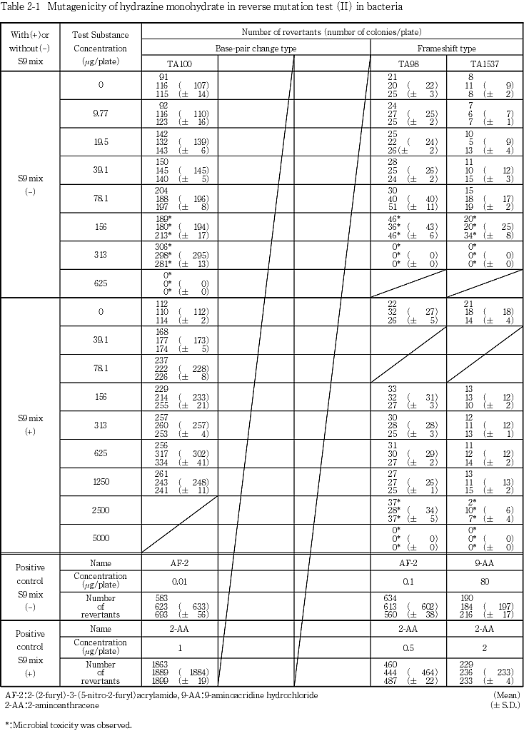 以上の結果から,ヒドラジン一水和物は本試験系において変異原性を有する(陽性)と判定した.