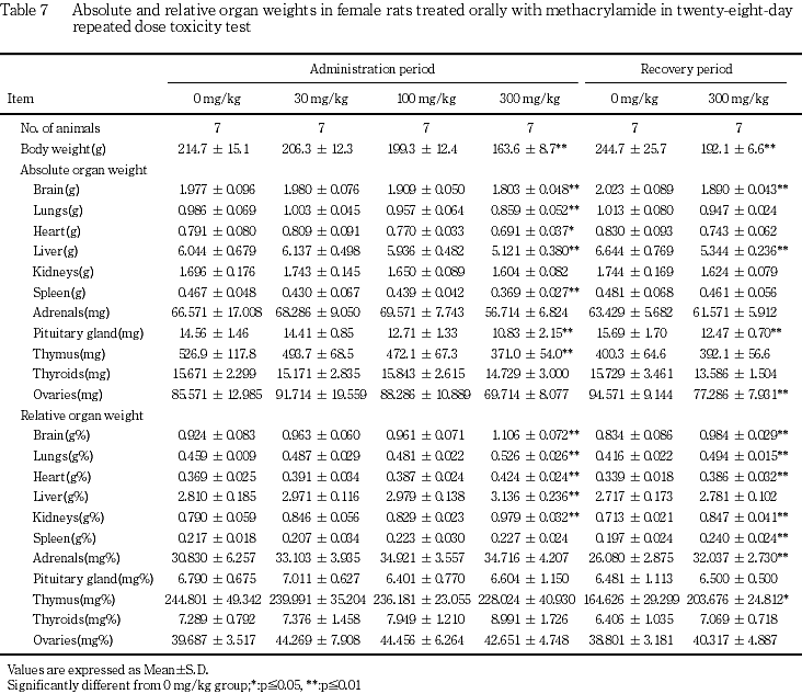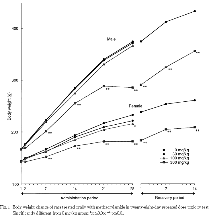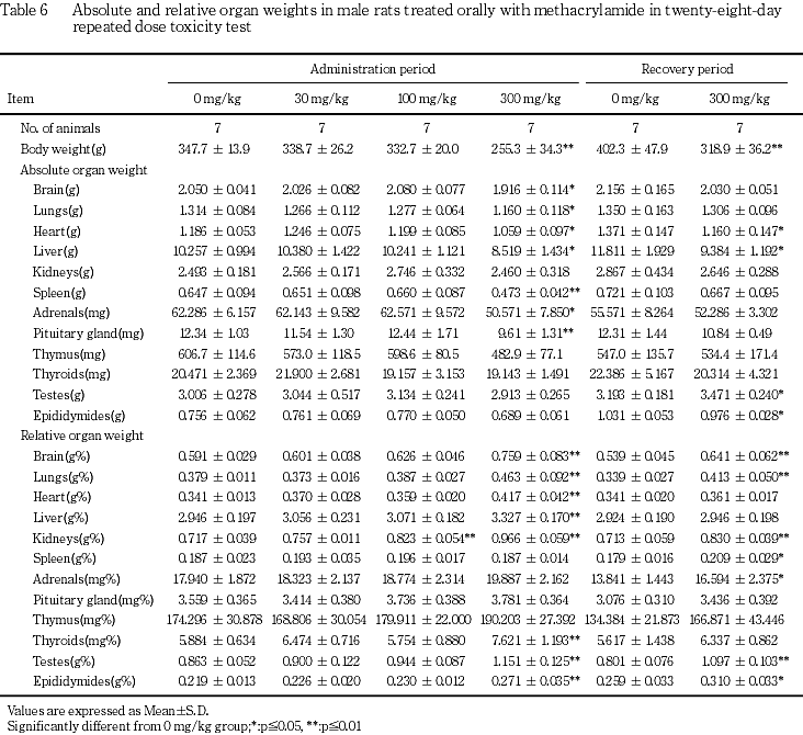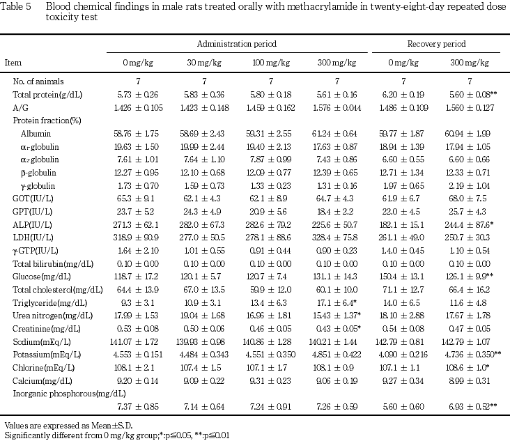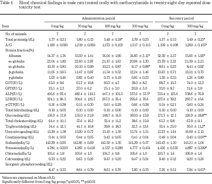 その他にも,体重では,300 mg/kg群の雌雄で投与2日から体重増加抑制が認められ,投与7日以降にも低く推移し,この体重増加抑制は回復期間中にも認められた.また,投与28日には100 mg/kg群の雌でも認められた.摂餌量では,300 mg/kg群の雌雄で摂餌量の低下が投与2日以降に散見されたが,この摂餌量の低下は回復期間の後半には回復した.また投与4週に300 mg/kg群の雌雄で飲水量の低下がみられ,雌では回復2週にも認められた.血液学検査では,300 mg/kg群の雌雄および100 mg/kg群の雄で貧血傾向が認められたが,回復終了時には雄で血小板数の増加が,雌で血小板数の増加およびプロトロンビン時間の延長が認められたのみであった.血液生化学検査では,300 mg/kg群の雌雄でアルブミンの増加,α1-グロブリンおよびアルカリホスファターゼの低下がみられ,雄でα2-グロブリンの低下,雌でトリグリセリドの増加,尿素窒素およびクレアチニンの低下が認められた.回復終了時では,300 mg/kg群の雄でA/G比,アルブミン,カリウムおよび無機リンの増加,総蛋白,グルコースおよびトリグリセリドの低下,雌でアルカリホスファターゼ,カリウム,クロールおよび無機リンの増加,総蛋白およびグルコースの低下が認められた.これらの変化はメタクリルアミドの直接の毒性あるいはメタクリルアミドによる神経毒性に関連した変化と考えられた.