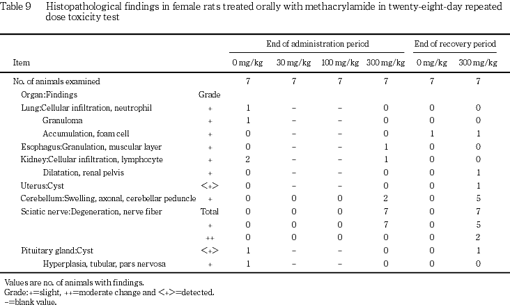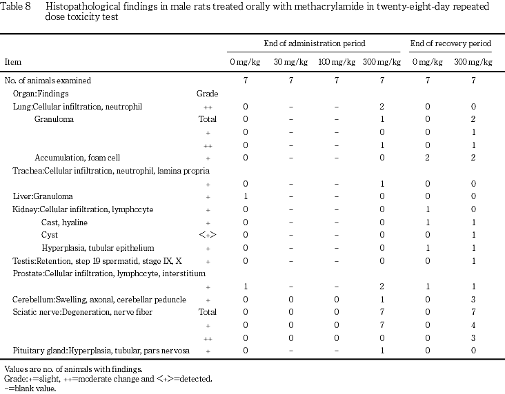 対照群および300 mg/kg群で投与終了時および回復終了時にみられたその他の変化にはメタクリルアミド投与との関連性は認められなかった。