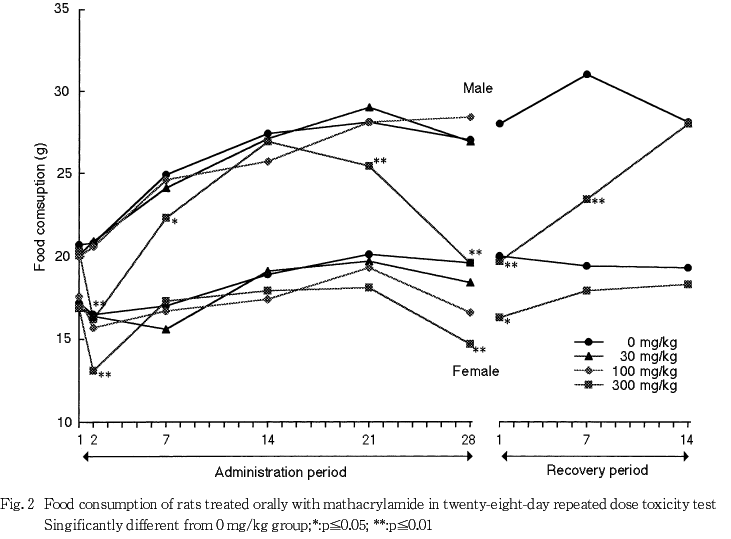 摂餌量では,300 mg/kgで雌雄とも摂餌量の低下が,投与初期から回復期間の前半まで継続したが,回復期間終了の時点では対照群とほぼ同等まで回復した.