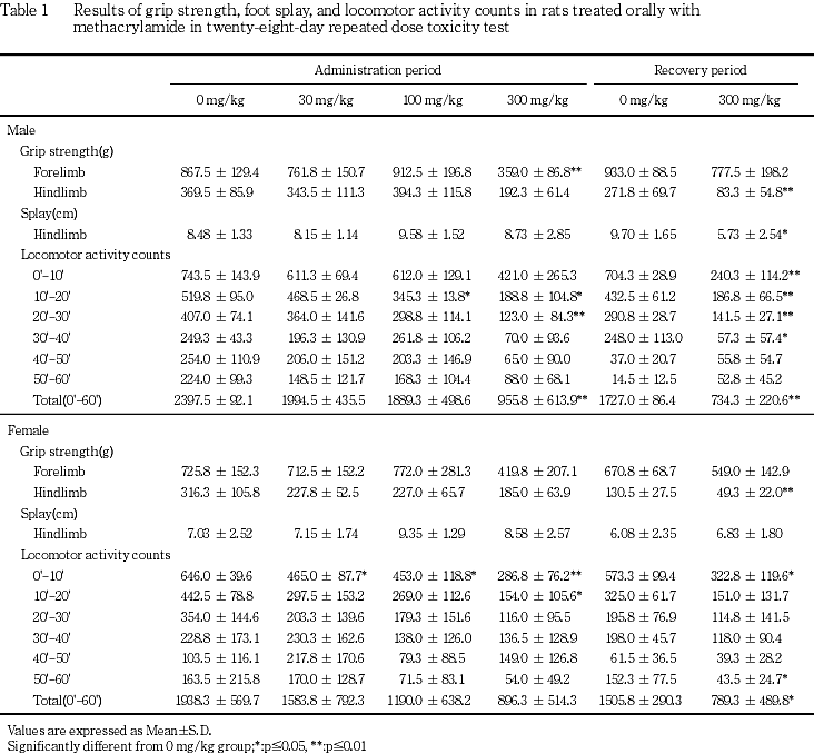 回復期間中は,300 mg/kg群で,雌雄とも回復7および14日に筋緊張の低下および歩行失調がみられ,そのスコアに有意差が認められた.また,回復2週に雌雄とも後肢に有意な握力の低下がみられ,また自発運動量では,雄で0〜10,10〜20,20〜30および30〜40分ならびに60分間のカウント数,雌で0〜10および50〜60分のカウント数ならびに60分間のカウント数に有意な低下が認められた.雄ではさらに後肢に有意な着地開脚幅の低下も認められた.