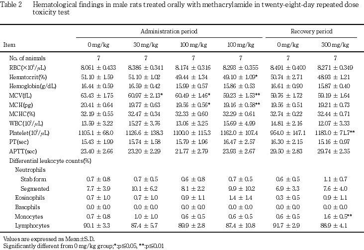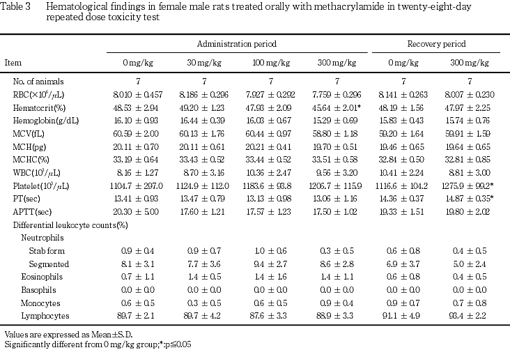 血液学検査では,雌雄の300 mg/kg群でヘマトクリット値およびヘモグロビン量の低下あるいは低下傾向が認められ,雄の100 mg/kg群でもヘマトクリット値およびヘモグロビン量に低下傾向が認められた.また,雄の100および300 mg/kg群では平均赤血球容積および平均赤血球ヘモグロビン量にも低下が認められた.この貧血傾向は,雌雄の300 mg/kg群において神経症状が継続して認められたこと,体重の低下が投与7日以降継続して認められ,投与28日には減少あるいは停滞したこと,ならびに摂餌量の低下が継続的に認められたことに関連した二次的な変化と考えられた.しかし,骨髄あるいは脾臓に毒性を示唆する変化は認められず,回復期間には,これら貧血傾向を示唆する変化は認められなかった.また,雌雄の300 mg/kg群に血小板数の増加,雌のプロトロンビン時間の延長が認められ,この変化も,神経症状ならびに体重と摂餌量の低下が継続した影響によるものと考えられた.