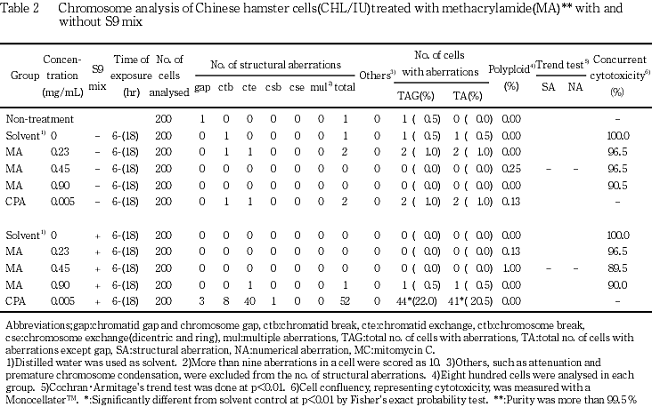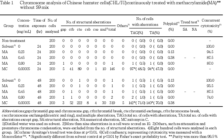 メタクリルアミドの培養細胞に及ぼす細胞遺伝学的影響について,チャイニーズ・ハムスター培養細胞(CHL/IU)を用いて染色体異常試験を実施した.