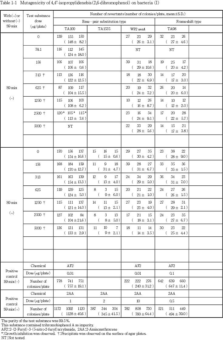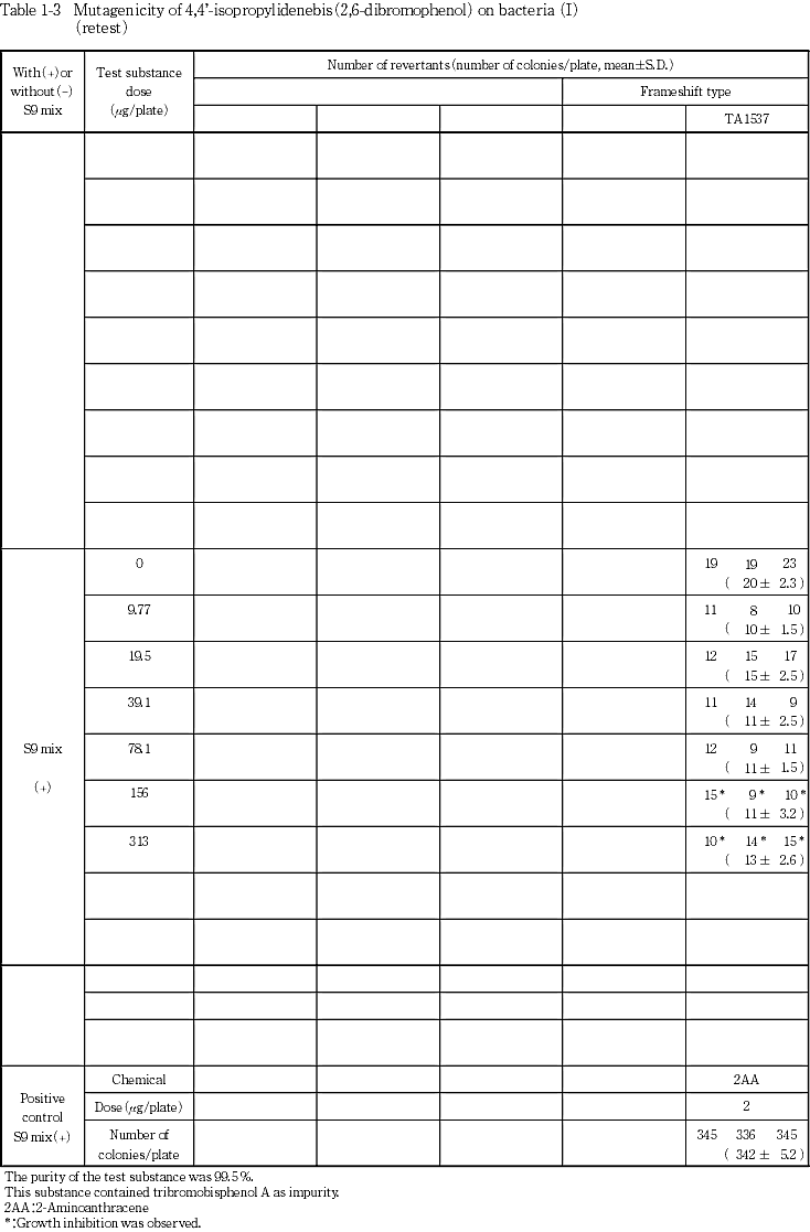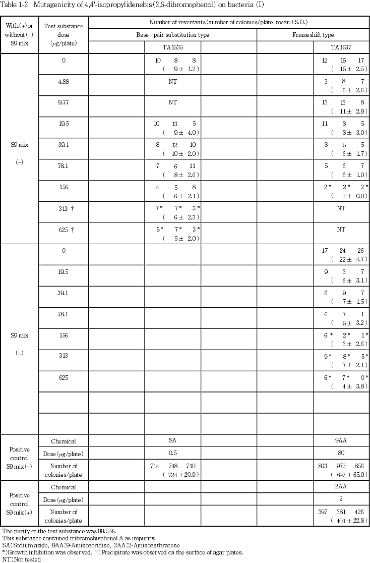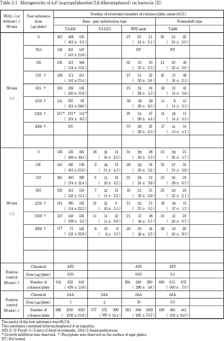 以上の結果から4,4'-イソプロピリデンビス(2,6-ジブロモフェノール)は,用いた試験系において変異原性を有しないもの(陰性)と判定した.