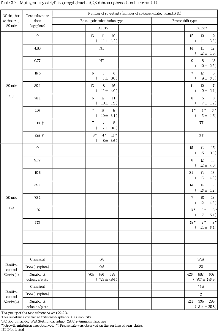 なお4,4'-イソプロピリデンビス(2,6-ジブロモフェノール)は,当研究所で本試験と並行して実施したチャイニーズ・ハムスター培養細胞を用いる染色体異常試験では陰性であった4).また,関連物質であるビスフェノールAについては,復帰変異試験で陰性の結果が得られている5).