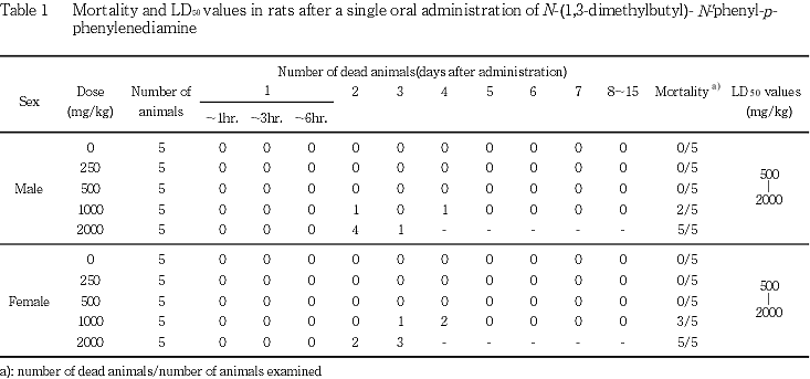 これらのことより,本試験条件下ではN-(1,3-ジメチルブチル)-N'-フェニル-p-フェニレンジアミンの雌雄ラットにおけるLD50値は500〜2000 mg/kgの間にあると推定され,経口投与時の標的器官は主に消化管および呼吸器であることが推測された.