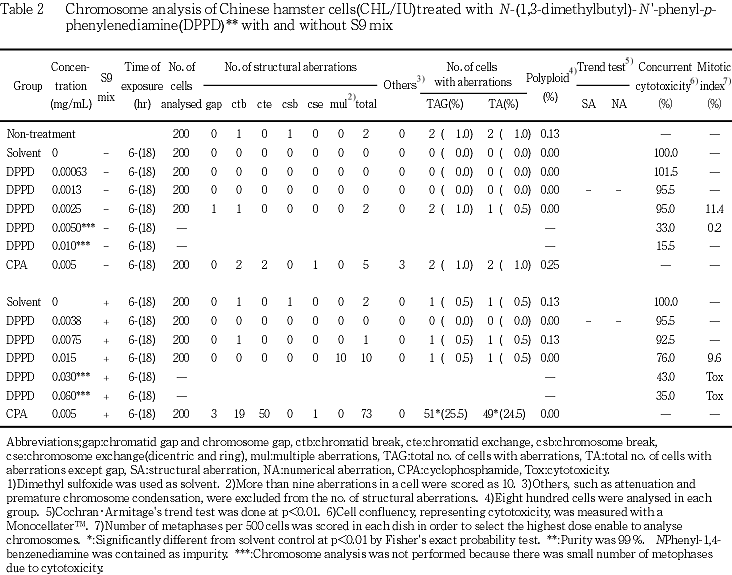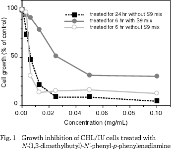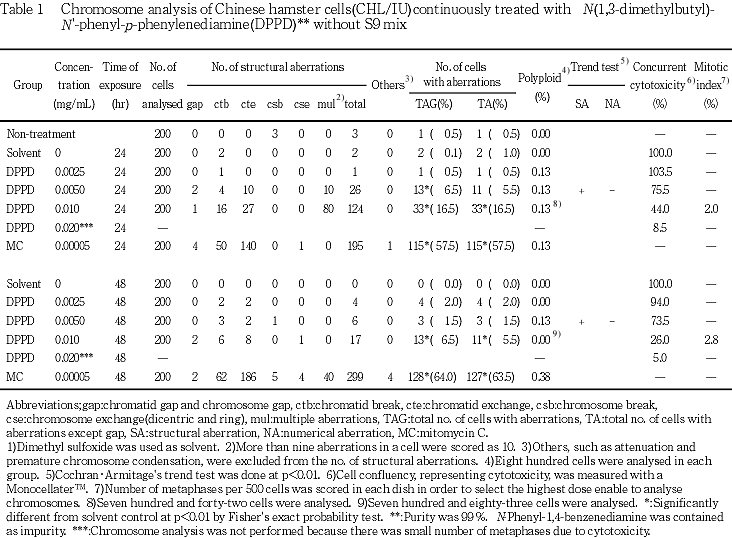 従って,N-(1,3-ジメチルブチル)-N'-フェニル-p-フェニレンジアミンは,上記の試験条件下で,試験管内の CHL/IU細胞に染色体異常を誘発すると結論した.