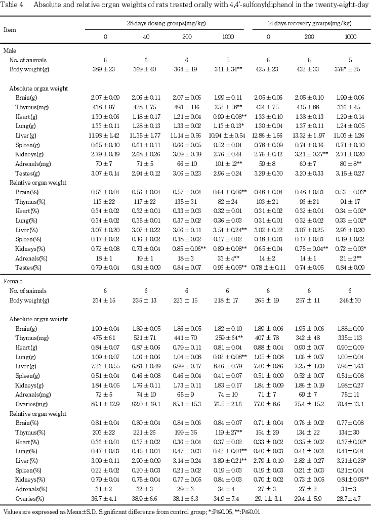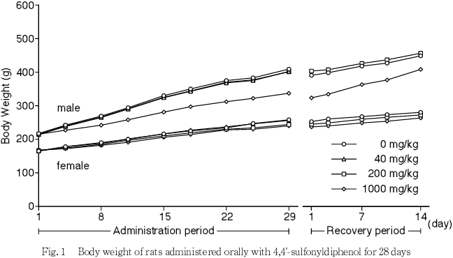 以上の結果から,本試験条件下における4,4'-スルホニルジフェノールの無影響量は,雌雄ともに40 mg/kg/dayと考えられた.