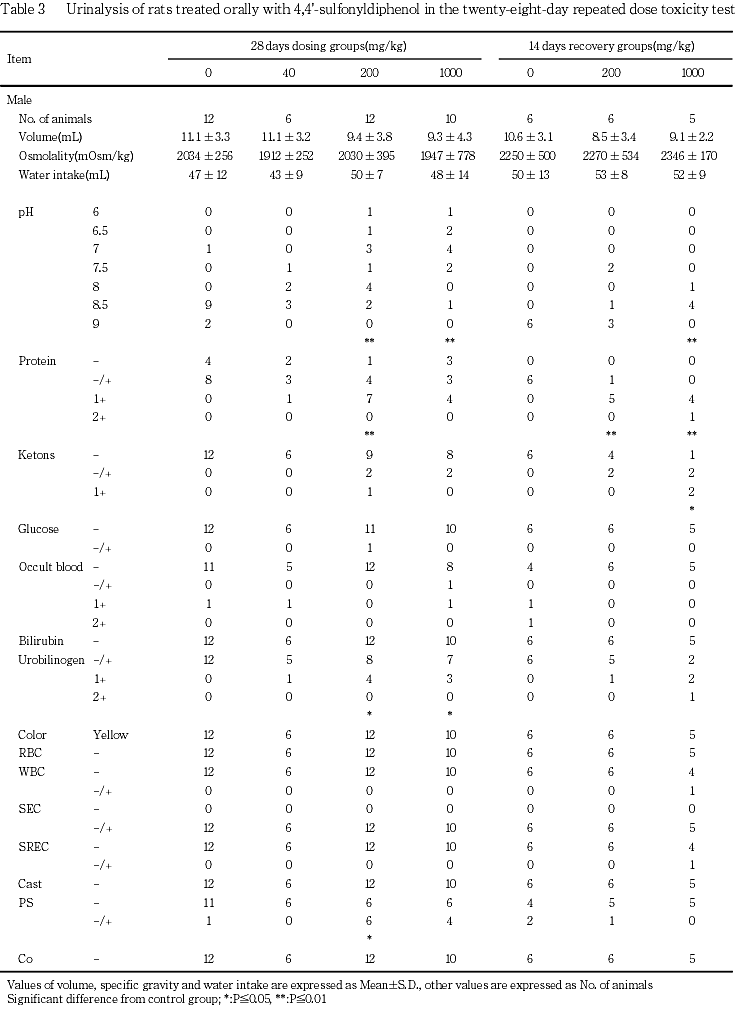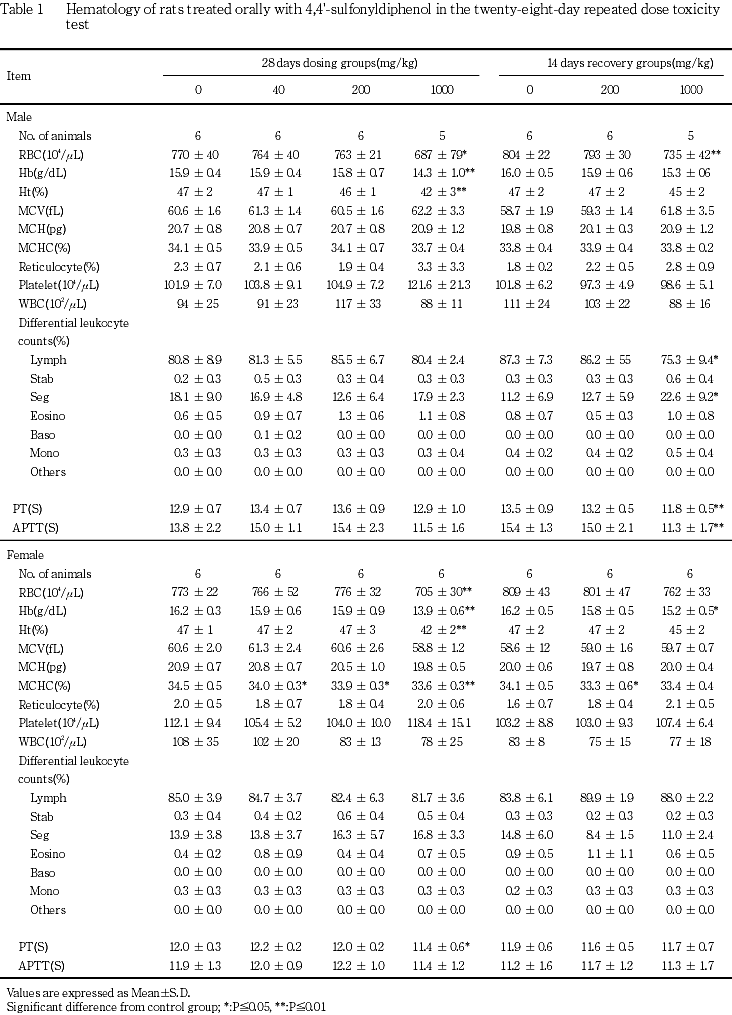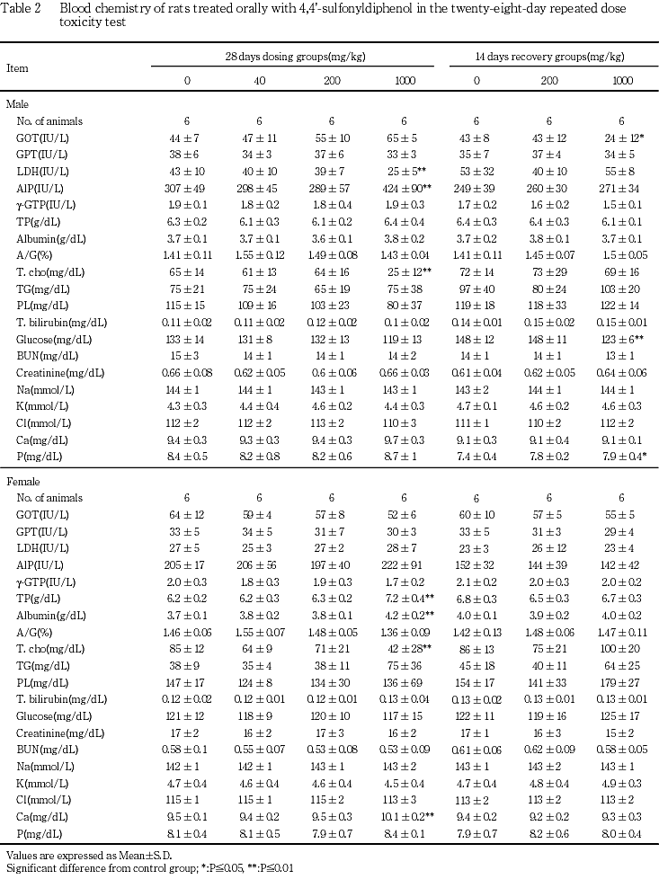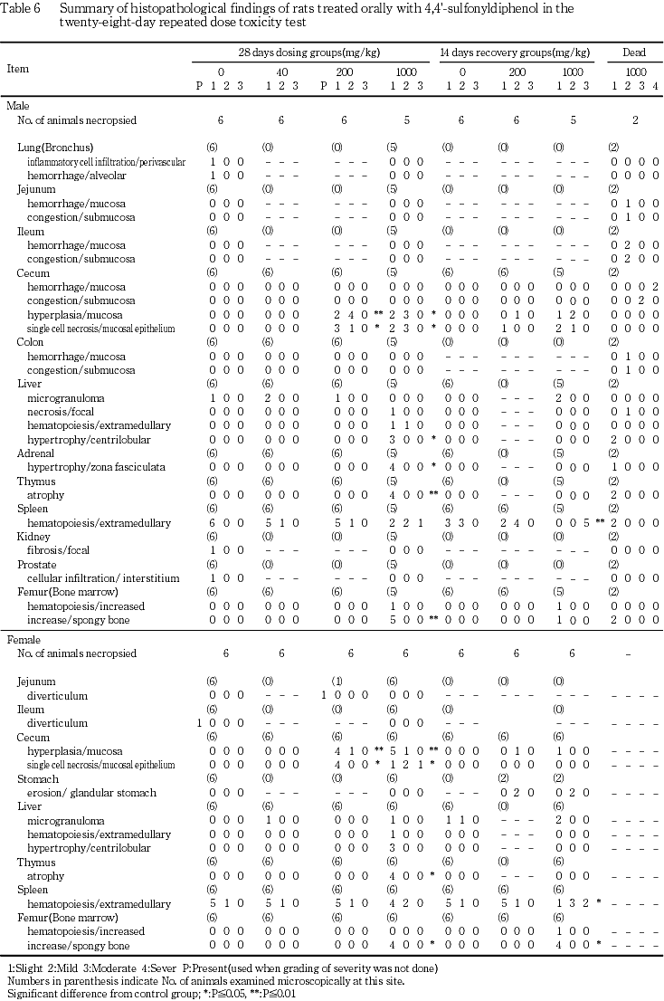 以上の如く,4,4'-スルホニルジフェノールをラットに28日間反復投与した結果,主な変化として200および1000 mg/kg群では盲腸における粘膜の過形成と粘膜上皮の単細胞壊死および尿蛋白陽性例の増加が雌雄に,腎臓の重量増加が雄にみられた.1000 mg/kg群ではこれに加えて盲腸の肉眼的拡張,赤血球数,ヘモグロビン量,ヘマトクリット値ならびに総コレステロールの減少,胸腺の肉眼的および組織学的な萎縮ならびに重量減少,肝臓の重量増加,小葉中心性の肝細胞肥大ならびに髄外造血および大腿骨における海綿骨の増加が雌雄に,副腎の重量増加と皮質束状帯細胞の肥大,脾臓の髄外造血の亢進,骨髄(大腿骨)における造血の亢進およびアルカリホスファターゼの増加が雄にみられた.一方40 mg/kg群の雌雄では変化は認められなかった.