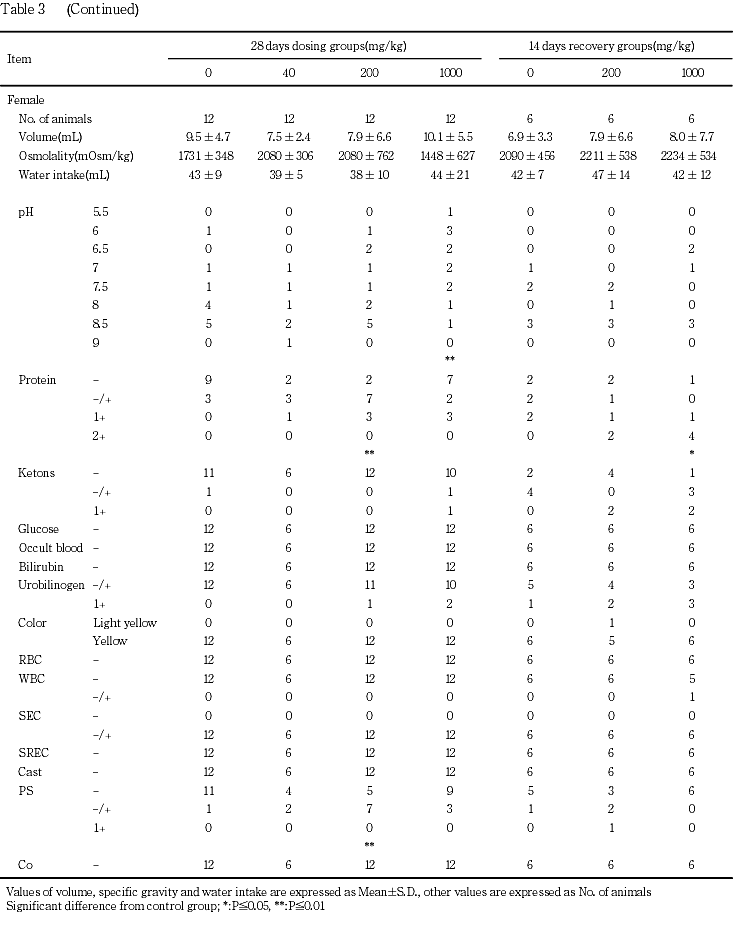 雌では,200 mg/kg群で尿たん白陽性例の増加傾向がみられ,1000 mg/kg群で尿たん白陽性例の有意な増加,pHの低下傾向およびケトン体陽性例の増加傾向がみられた.