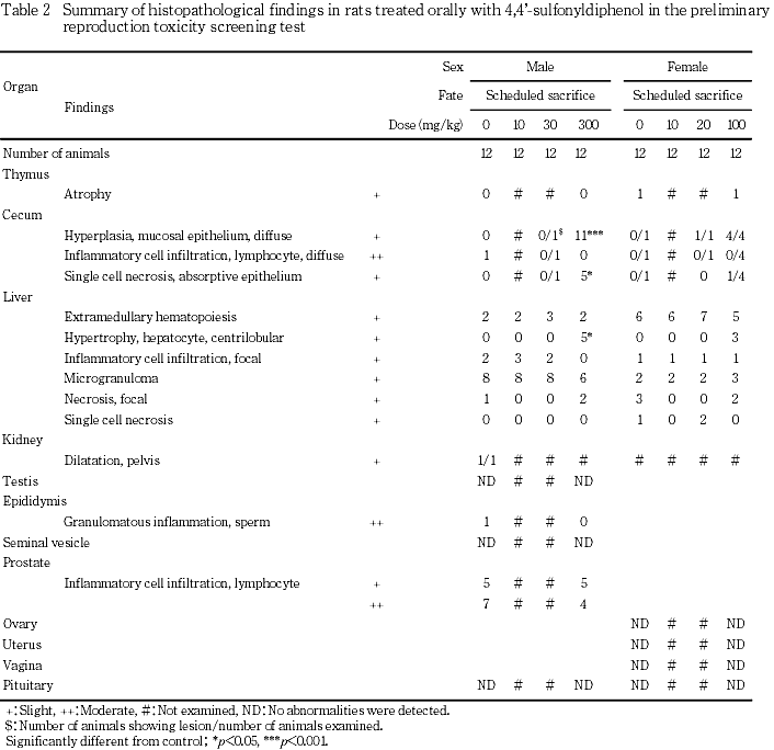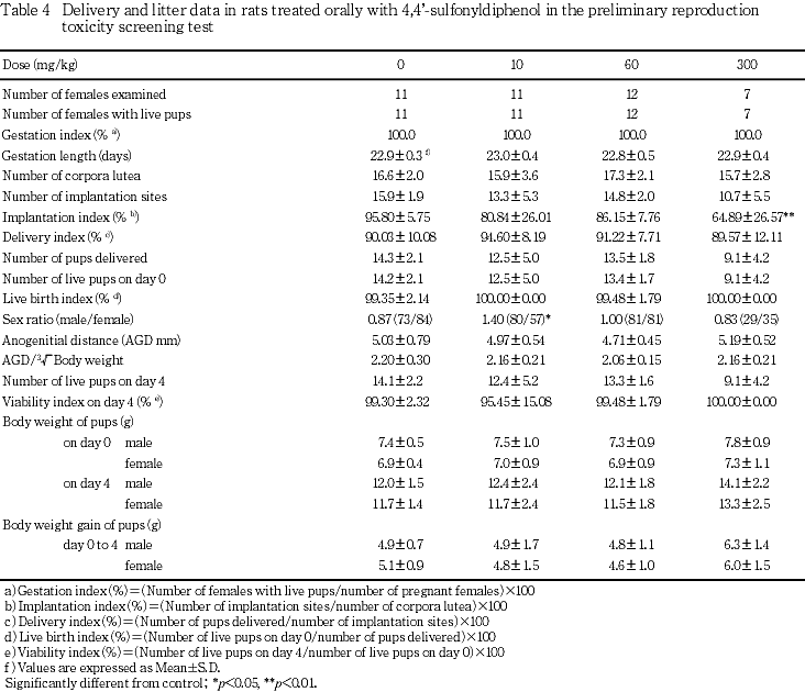 投与量設定試験として,SD系ラットの雌雄それぞれ各群3匹を用いて,4,4'-スルホニルジフェノールを100,300および1000 mg/kgの用量で14日間経口投与した.その結果,300および1000 mg/kg群の雌雄で体重の増加抑制あるいは減少,摂餌量の低値傾向あるいは低値,精のう重量の低値がみられ,300 mg/kg群の雄で盲腸の膨満が認められた.さらに,1000 mg/kg群では雌雄で盲腸の膨満,雄の胸腺,前立腺の低値などが認められた.以上の結果から,本試験では高用量を300 mg/kgとし,以下公比約5で中用量を60 mg/kg,低用量を10 mg/kgとした.また,媒体(0.1 % Tween 80添加0.5 % CMC-Na水溶液)のみを投与する対照群を設けた.投与期間は,雌雄とも交配前14日間,交配期間および雄は剖検前日までの計45日間,雌は交尾成立後,妊娠,分娩を経て哺育3日(交尾確認日を妊娠0日,分娩確認日を哺育0日とした)までの計40〜46日間とした.ただし,非分娩動物は交尾確認後25日まで投与した.投与の際はテフロン製胃ゾンデを用いて1日1回,午前中に強制経口投与した.投与液量は5 mL/kgとし,至近測定日の体重を基に算出した.
