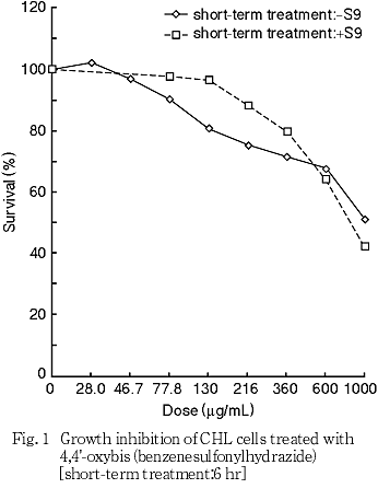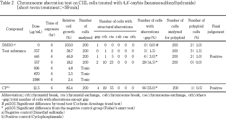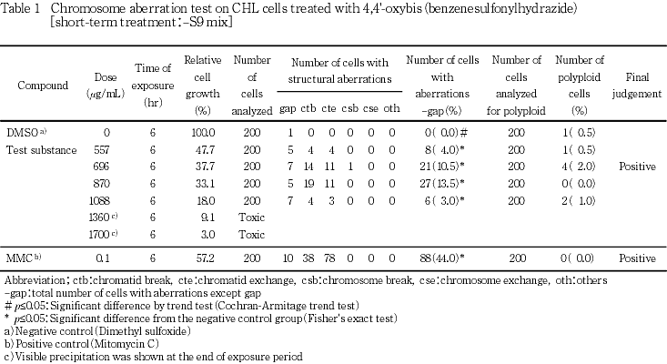 以上の結果より,本試験条件下では4,4'-オキシビス(ベンゼンスルホニルヒドラジド)は,染色体異常を誘発する(陽性)と結論した.
