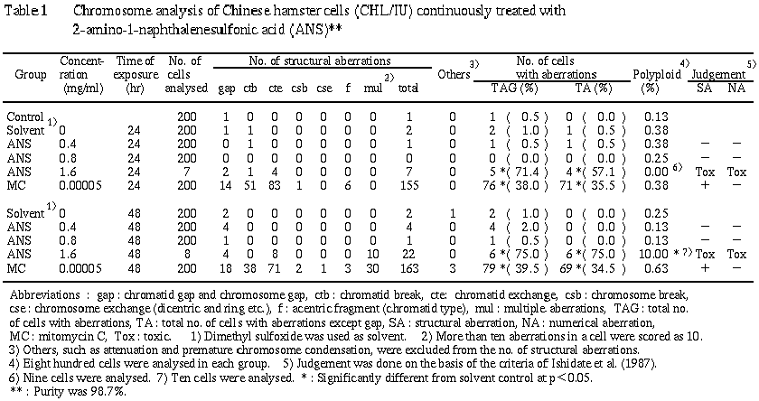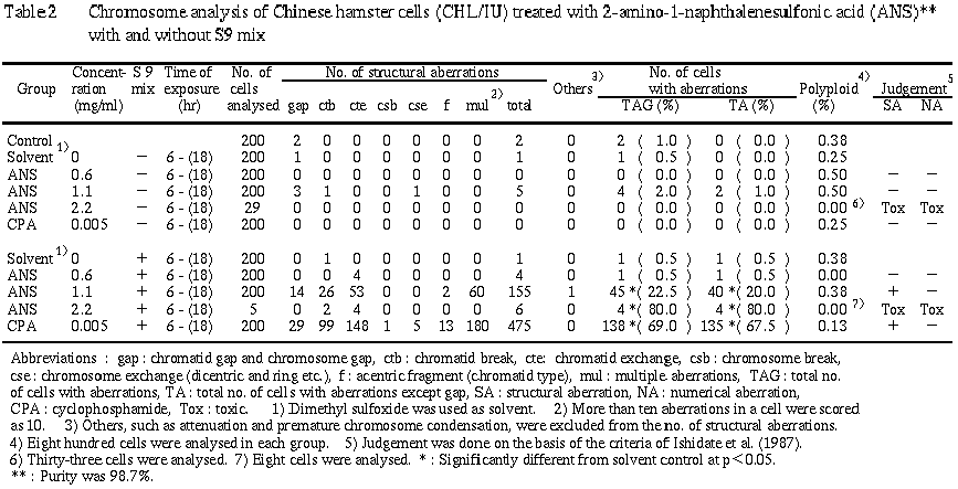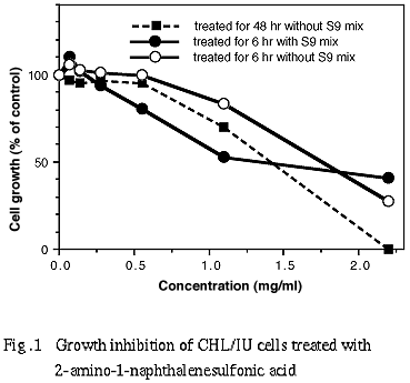 CHL/IU細胞を24時間連続処理した高濃度群 (1.6 mg/ml) では,細胞毒性のため十分な細胞数を分析できなかったが,その他の処理群においては,染色体の構造異常や倍数性細胞の誘発作用は認められなかった.また,代謝活性化法では,S9 mix非存在下およびS9 mix存在下で6時間処理した高濃度群 (2.2 mg/ml) では,細胞毒性により十分な細胞数を分析できなかったが,S9 mix非存在下のその他の処理群では,染色体の構造異常や倍数性細胞の誘発作用は認められなかった.一方,S9 mix存在下の中濃度群 (1.1 mg/ml) では,観察した細胞の22.5%に染色体の構造異常が誘発され,陽性の結果が得られた.しかしながら,2-アミノ-1-ナフタレンスルホン酸を培養液に添加すると培養液の色が黄色化することから,本実験で誘発された染色体異常に関しては,それ自身によるDNA傷害作用に起因する可能性に加えて,被験物質添加による培養液の酸性化による可能性も示唆された.