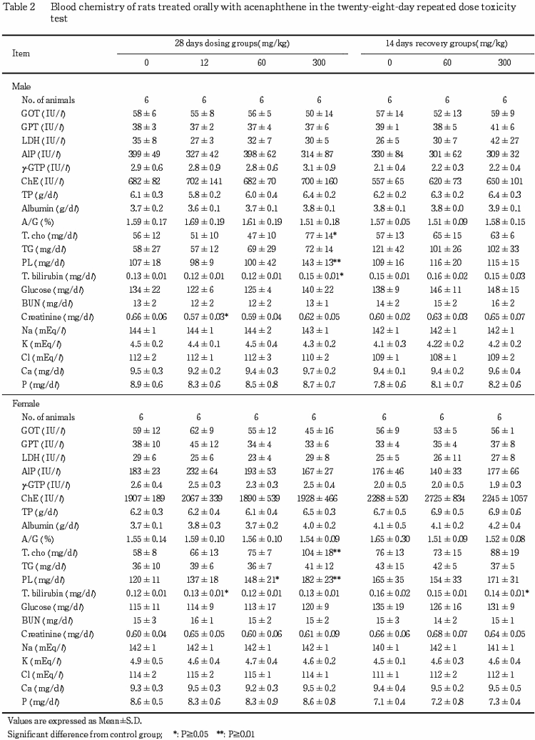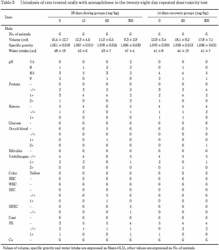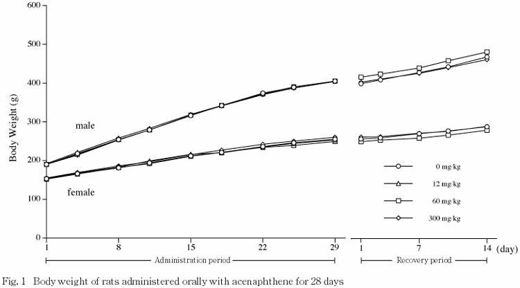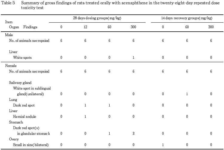 以上の結果から,本試験条件下におけるアセナフテンの無影響量は雌雄ともに12mg/kg/dayと考えられた.