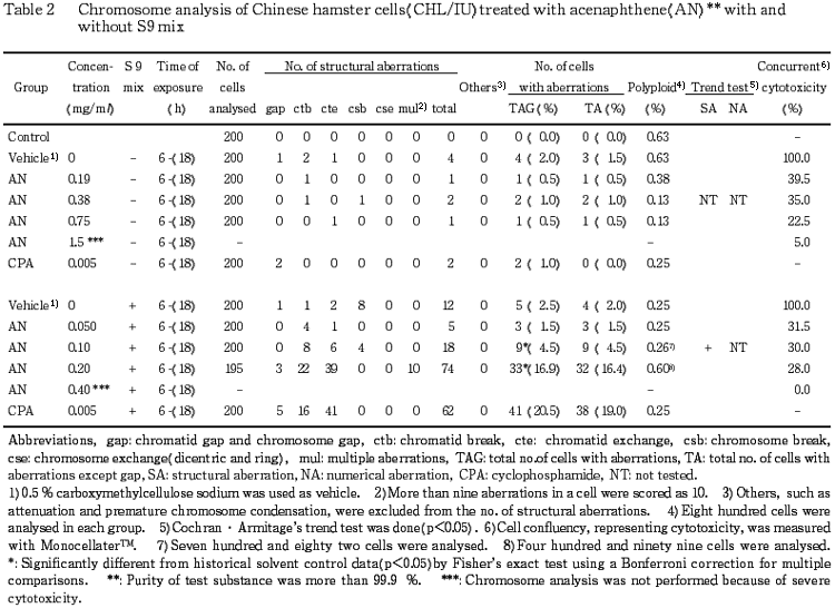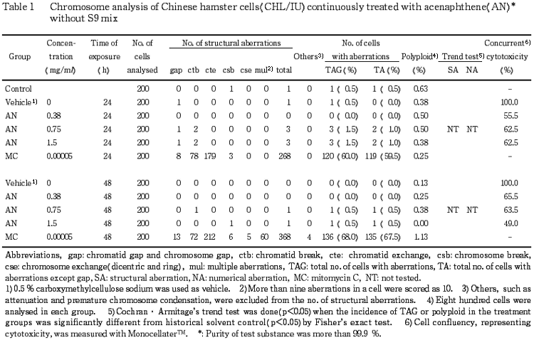 以上の結果より,本試験条件下でアセナフテンは,染色体異常を誘発する(陽性)と結論した.