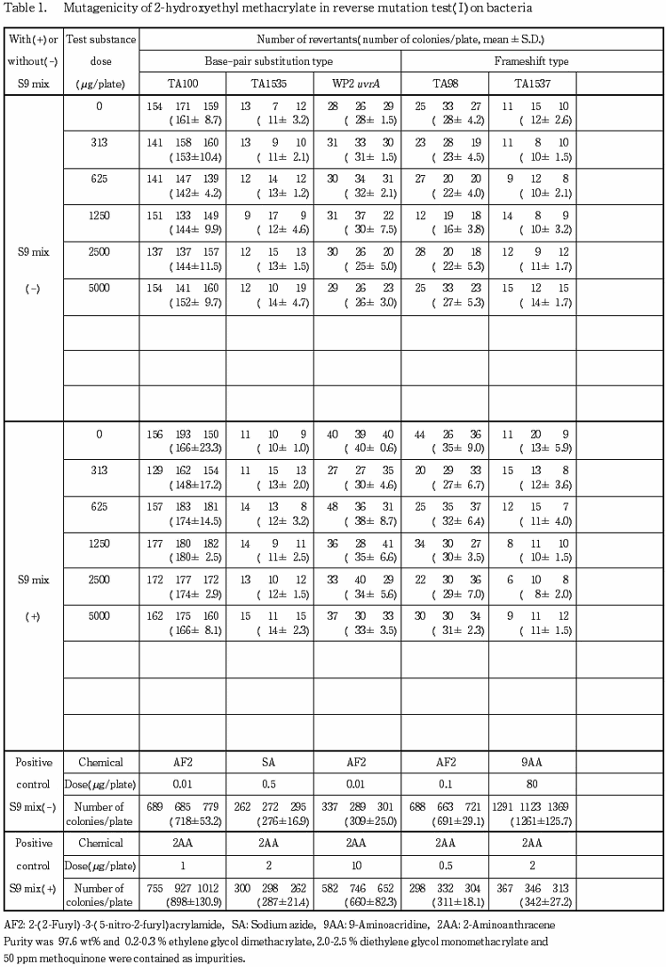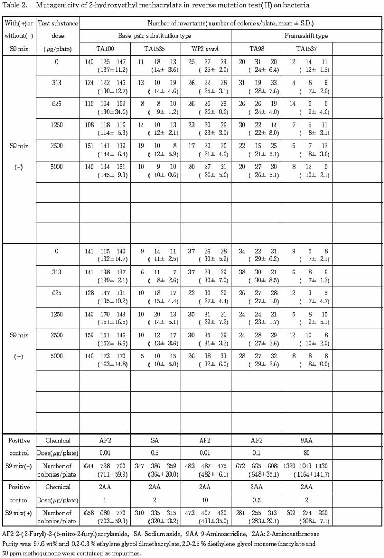 以上の結果に基づき,メタクリル酸2-ヒドロキシエチルエステルは,用いた試験系において変異原性を有しない(陰性)と判定した.