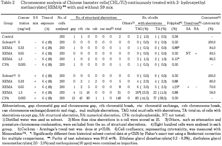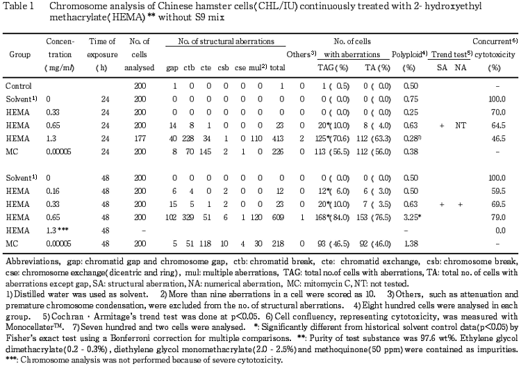 以上の結果より,本試験条件下でメタクリル酸 2-ヒドロキシエチルエステルは,染色体異常を誘発する(陽性)と結論した.