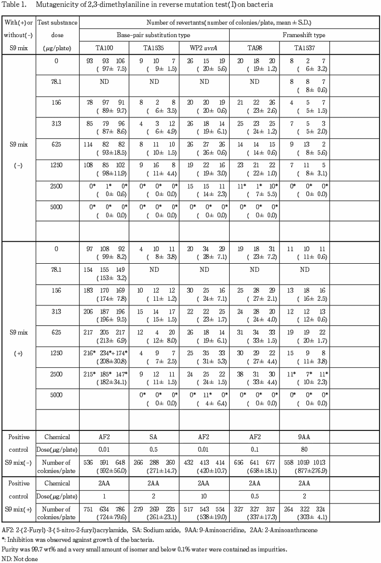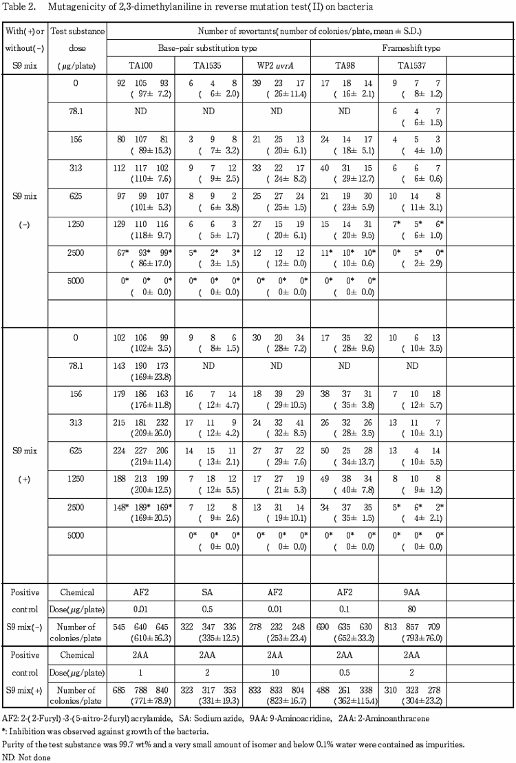 以上の結果から,2,3-ジメチルアニリンは,用いた試験系において変異原性を有する(陽性)と判定された.