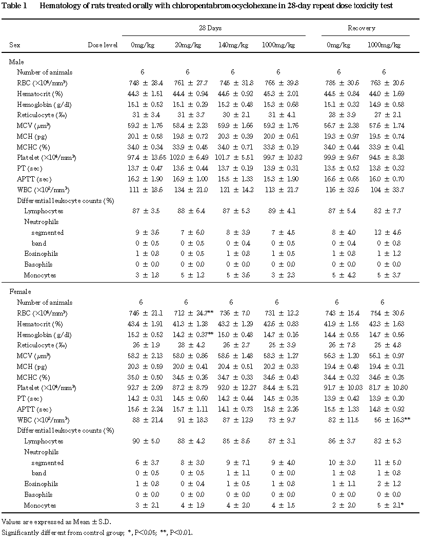 なお,投与期間終了時の検査において,赤血球数およびヘモグロビン濃度の減少が 20 mg/kg群の雌でみられたが,140および1000 mg/kg群では認められなかったことから,被験物質投与とは関連のない偶発的変化と判断した.また,回復期間終了時の検査において白血球数の減少および白血球百分率単球比の増加が1000 mg/kg群の雌で認められたが,軽微な変化であり,かつ投与期間終了時には認められていないことから,被験物質投与とは関連のない偶発的変化と判断した.