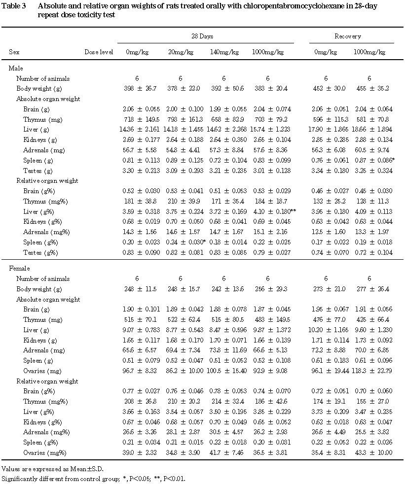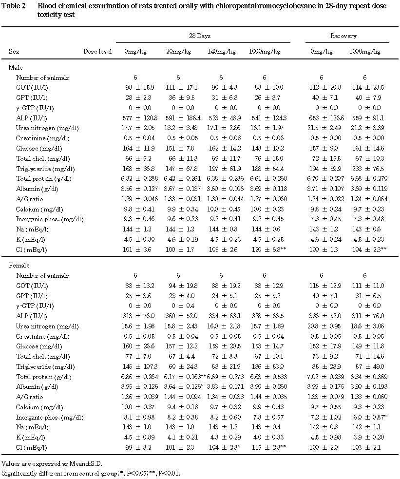 以上の結果から,本試験条件下におけるクロロペンタブロモシクロヘキサンの無影響量は,雄で 140 mg/kg/day,雌で1000 mg/kg/dayと考えられる.