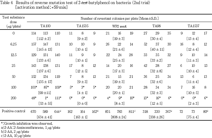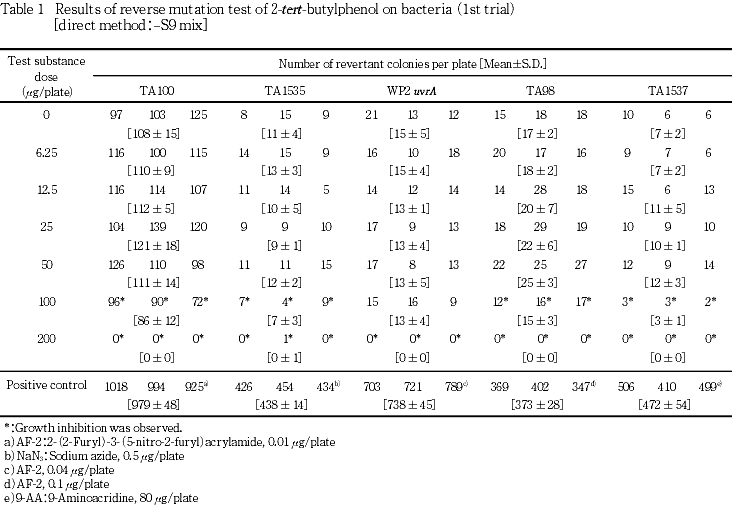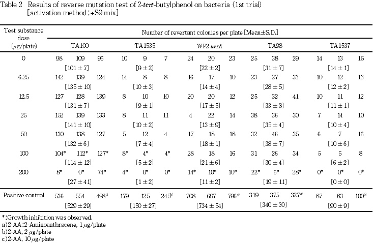 以上の成績から,本実験条件下では,2-tert-ブチルフェノールの遺伝子突然変異誘発性は陰性と判定した.