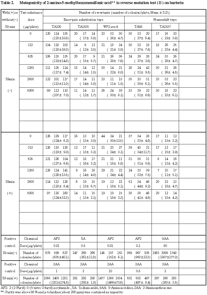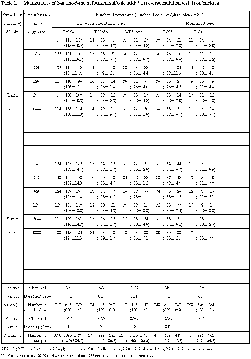 ¸¡Äê¶Ý¤È¤·¤Æ¡¤ Salmonella typhimurium TA100, TA1535, TA98, TA1537¤ª¤è¤ÓEscherichia coli WP2 uvrA¤Î5¶Ý³ô¤òÍѤ¤¡¤S9 mix̵ź²Ã¤ª¤è¤Óź²Ã¤Î¾ò·ï¤Ç¥×¥ì¡¼¥ÈË¡¤Ë¤è¤êÍÑÎÌÀßÄê»î¸³¤ª¤è¤ÓËܻ¤ò¹Ô¤Ã¤¿¡¥ÍÑÎÌÀßÄê»î¸³¤ò 50¡Á5000 ¦Ìg/¥×¥ì¡¼¥È¤ÎÍÑÎ̤ǹԤ俤Ȥ³¤í¡¤¤¹¤Ù¤Æ¤Î¸¡Äê¶Ý¤Ë¤ª¤¤¤ÆS9 mix̵ź²Ã»î¸³¤ª¤è¤Óź²Ã»î¸³¤Î¤¤¤º¤ì¤â¹³¶ÝÀ¤Ïǧ¤á¤é¤ì¤Ê¤«¤Ã¤¿¡¥¤·¤¿¤¬¤Ã¤Æ¡¤Ëܻ¤Ç¤ÏS9 mix̵ź²Ã»î¸³¤ª¤è¤Óź²Ã»î¸³¤ò313¡Á5000 ¦Ìg/¥×¥ì¡¼¥È¤ÎÈϰϤÇÍÑÎ̤òÀßÄꤷ¤Æ¼Â»Ü¤·¤¿¡¥
