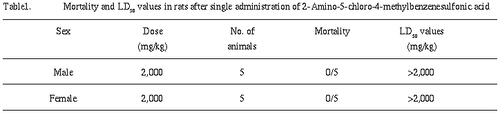 既存化学物質の安全性を評価するため、2−アミノ−5−クロロ−4−メチルベンゼンスルホン酸の2,000 mg/kgをラットに強制経口投与し、急性毒性を検討した。