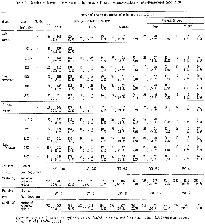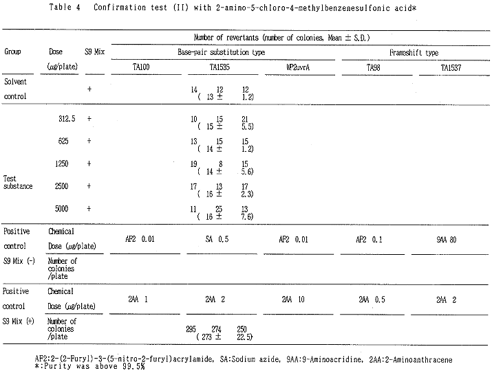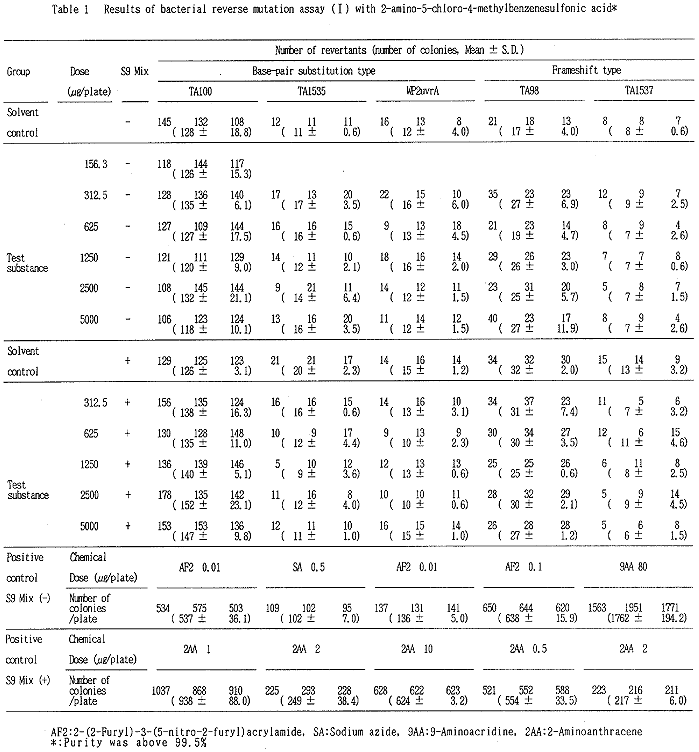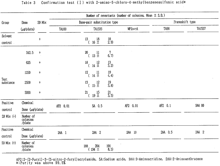 その結果、2回の本試験とも、用いた5種類の検定菌について、いずれの用量でも復帰変異コロニー数の増加が認められなかったことから、2−アミノ−5−クロロ−4−メチルベンゼンスルホン酸は、用いた試験系において変異原性を有しない(陰性)と判定された。