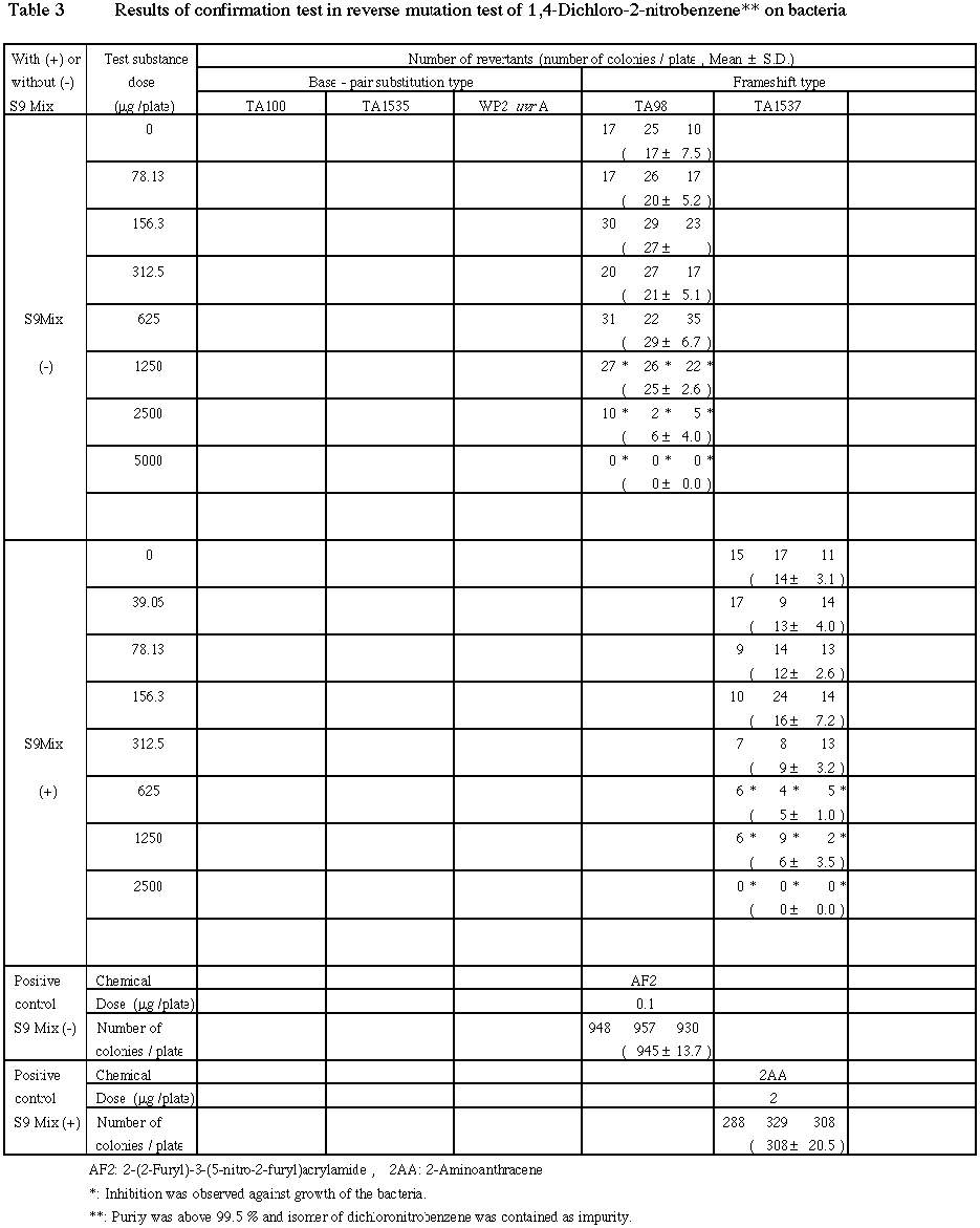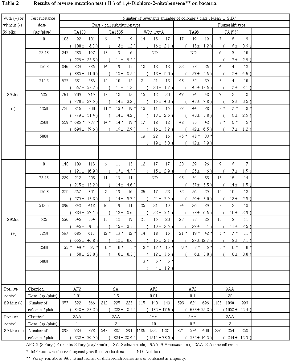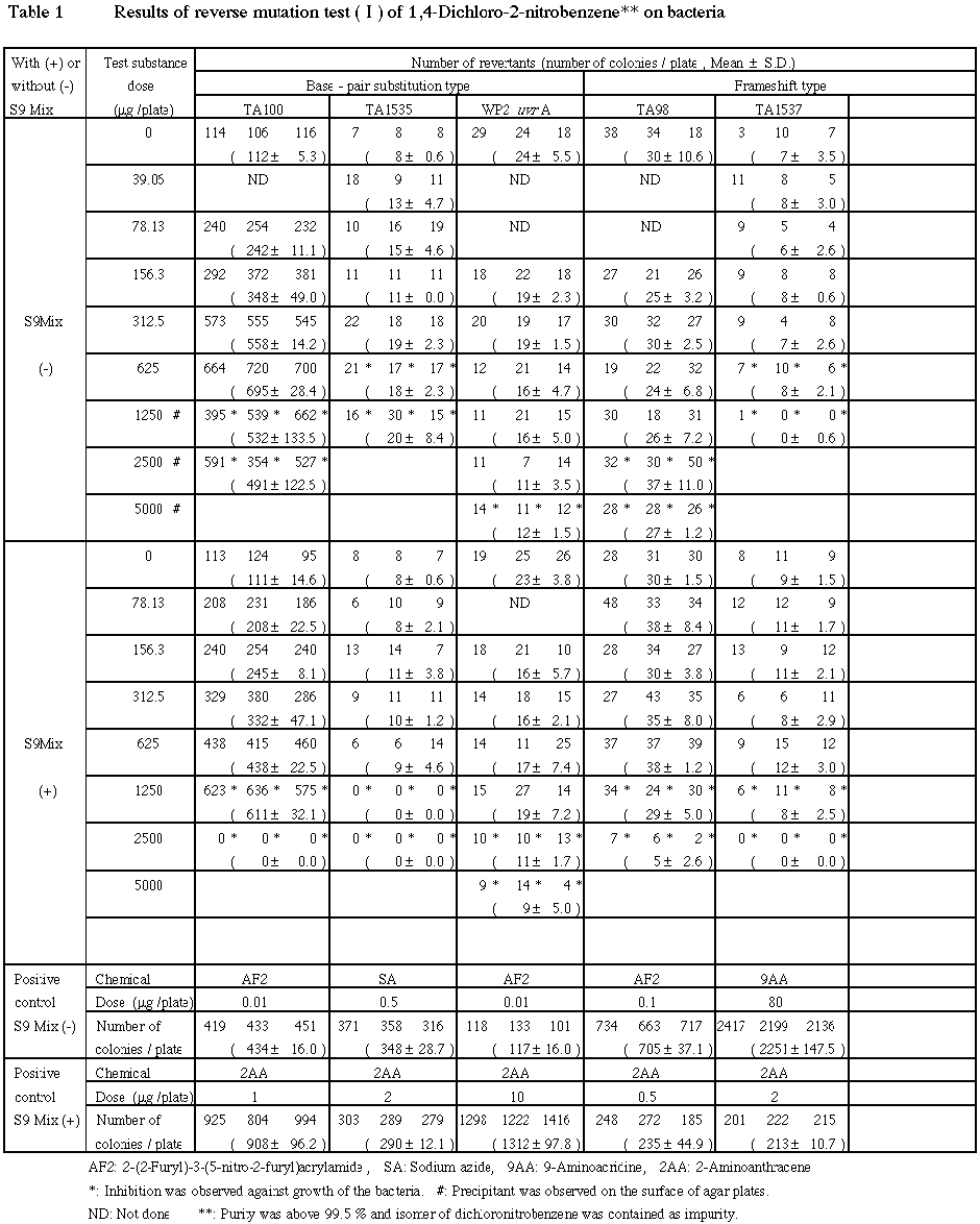 以上の結果に基づき,1,4-ジクロロ-2-ニトロベンゼンは,用いた試験系において変異原性を有する(陽性)と判定した.
