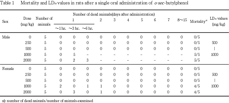 o-sec-ブチルフェノールの250,500,1000および2000 mg/kgを1群5匹からなる5週齢のSprague-Dawley系(Crj:CD)雌雄ラットに単回強制経口投与したところ,雄では1000 mg/kg以上の投与群で各5例全例が,雌では1000 mg/kg以上の投与群で4例がそれぞれ死亡したことから,本試験条件下では被験物質の雌雄ラットにおけるLD50値は,500〜1000 mg/kgの間にあると推定された.