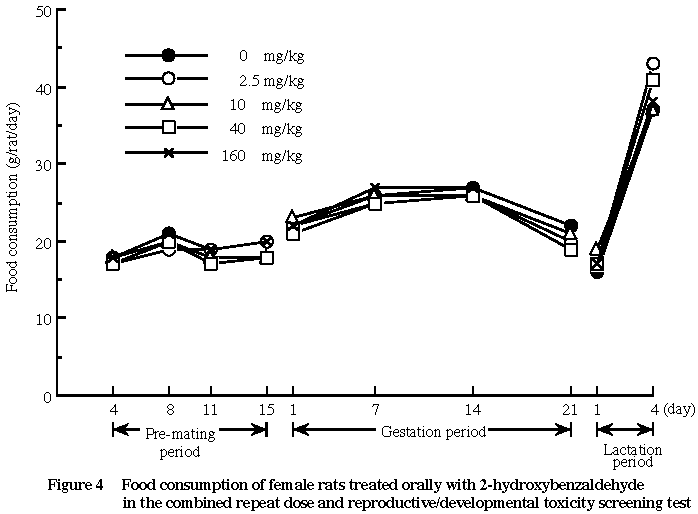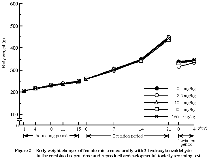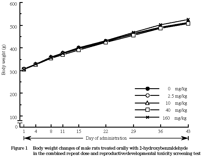 2-ヒドロキシベンズアルデヒドの投与量は,先に実施した予備試験の結果を参考にして2.5,10,40および160 mg/kgとした.