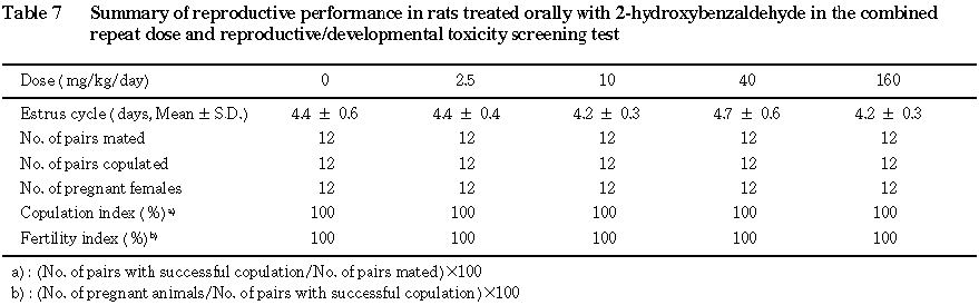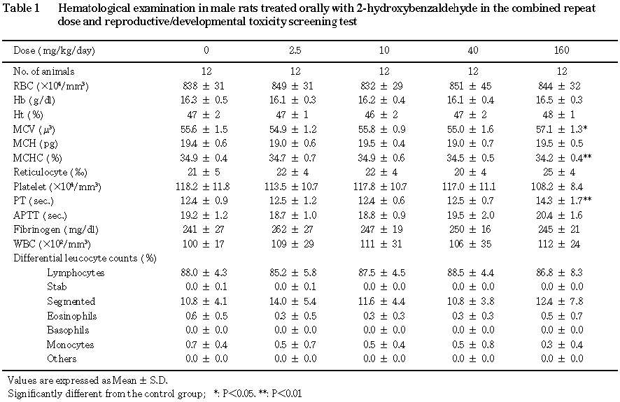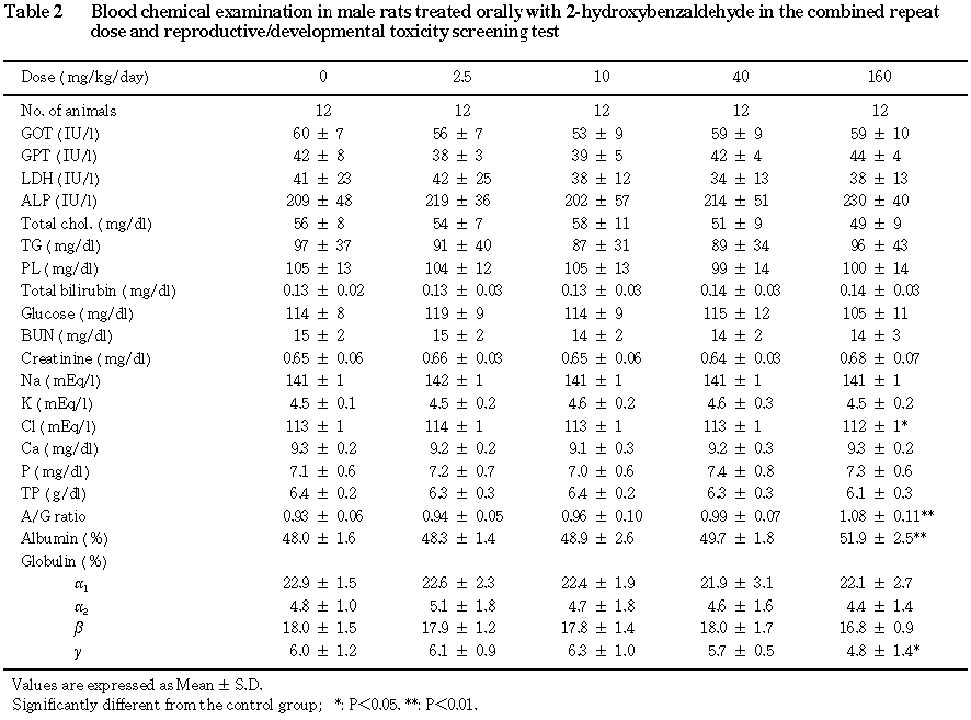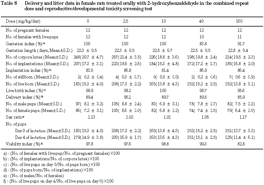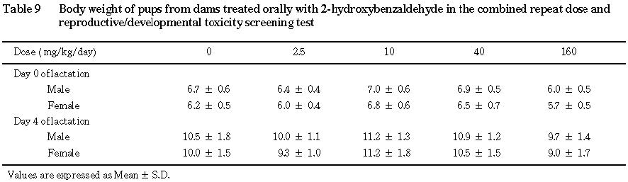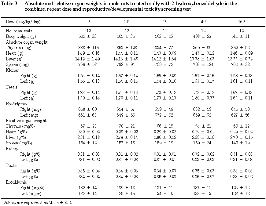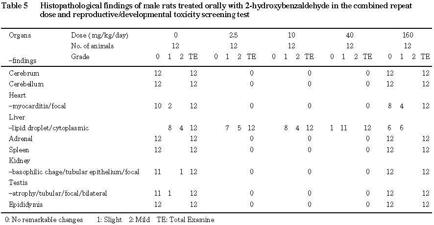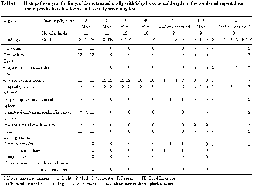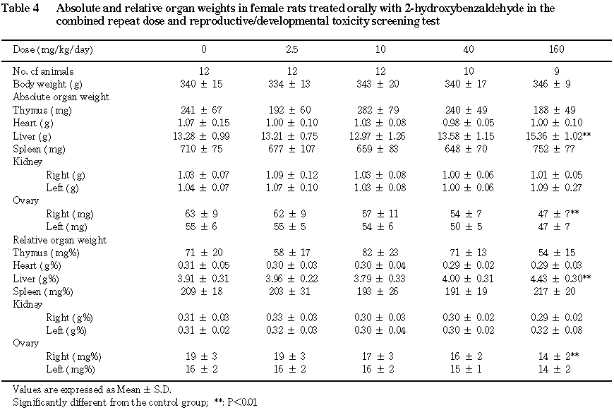 2-ヒドロキシベンズアルデヒドの反復投与により,160 mg/kg群において雌の肝臓重量が高値を,卵巣重量が低値を示し,病理組織学検査では雌雄に相違はあるものの40 mg/kg以上の投与群において肝臓に変化が認められた.したがって,本試験条件下における2-ヒドロキシベンズアルデヒドの一般毒性学的な無影響量は,雌雄ともに10 mg/kg/dayであると判断される.