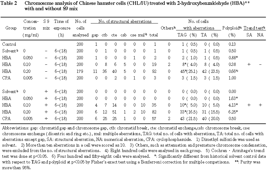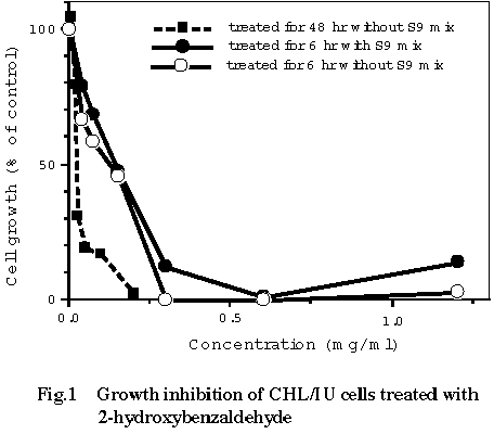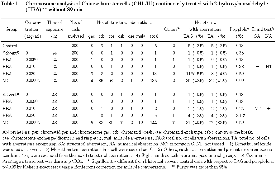 従って, 2-ヒドロキシベンズアルデヒドは,上記の試験条件下で,試験管内のCHL/IU細胞に染色体異常を誘発すると結論した.