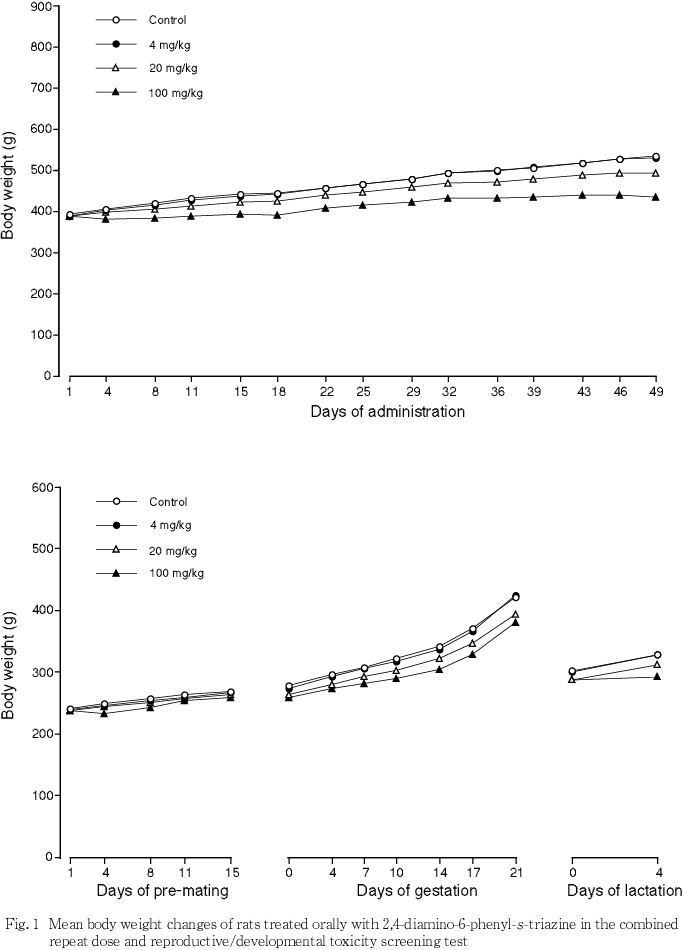 OECD既存化学物質安全性点検に係わる毒性調査の一環として,2,4-ジアミノ-6-フェニル-s-トリアジンの0(媒体対照),4,20および100 mg/kg/dayをCrj:CD(SD系)IGSラットの雌雄(各12匹/群)に交配前14日間,雄ではその後交配期間を含む35日間,雌では交配期間,妊娠期間および分娩後3日まで通して経口投与し,親動物に対する反復投与毒性および生殖能力ならびに次世代児の発生・発育に及ぼす影響について検討した.
