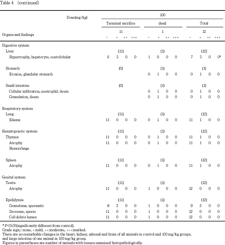 死亡例では,100 mg/kg群の雄1例で回腸の粘膜固有層から漿膜にかけて好中球性の細胞浸潤および肉芽形成,腺胃のびらん,肺の水腫,脾臓の萎縮,胸腺の萎縮および出血,雌1例で腺胃のびらん,肺の水腫,脾臓の萎縮および副腎の壊死が認められた.
