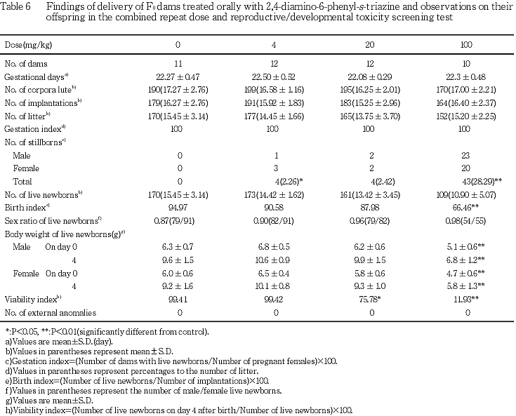 更に,100 mg/kg群では死産率の増加およびそれに伴う出生率の減少がみられたが,この変化については,前述した母動物の分娩直後の哺育行動の不良に起因したものと考えられた.また,20 mg/kg以上の群では,新生児の4日の生存率の減少がみられたが,この変化は,母動物に哺育行動の不良がみられ全児が死亡したことに起因したものであり,直接的な原因は母動物の哺育行動の不良と考えられた.また,新生児の体重では,100 mg/kg群で雌雄とも出生時の体重が低く,哺育4日においても増加抑制がみられたことから,胎生期および哺育期の被験物質投与による胎児および出生児の発育に及ぼす影響が示唆された.