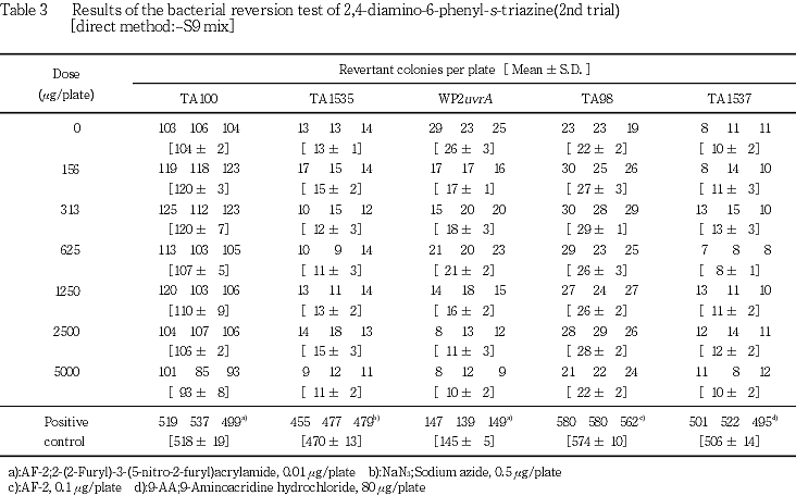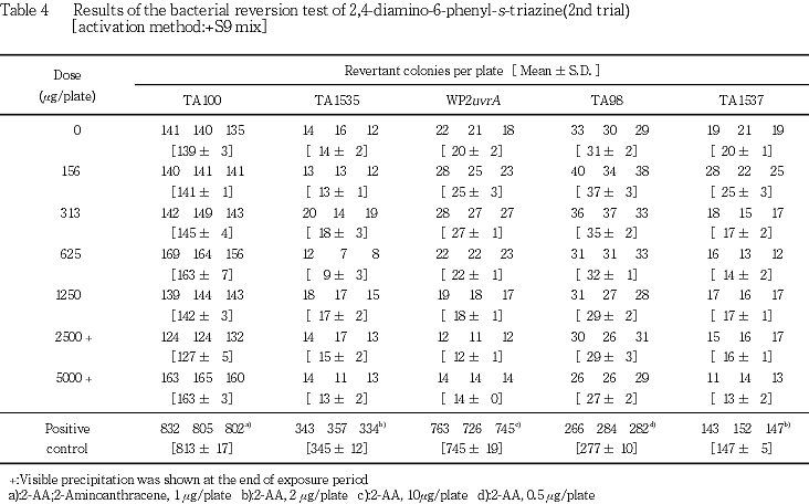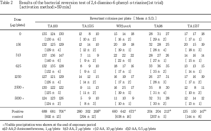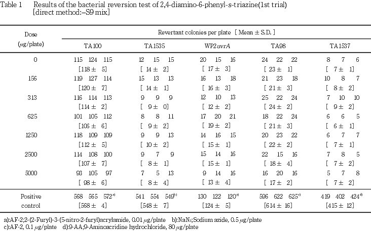 以上の結果より,本試験条件下では2,4-ジアミノ-6-フェニル-s-トリアジンは,変異原性を有しない(陰性)と結論した.