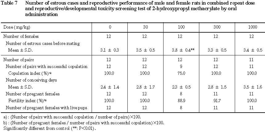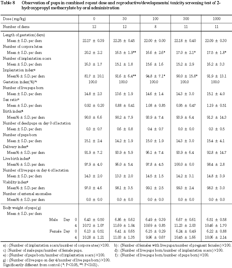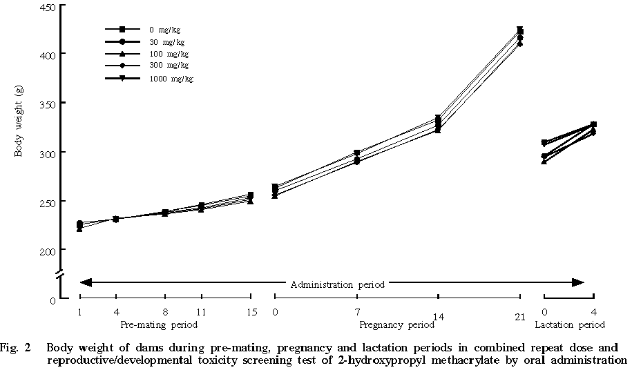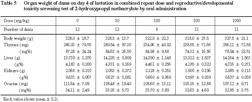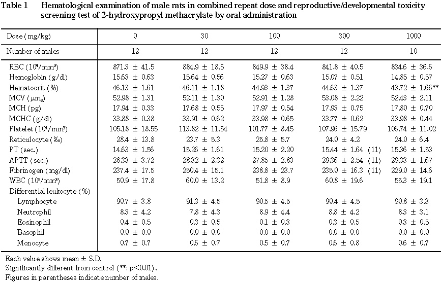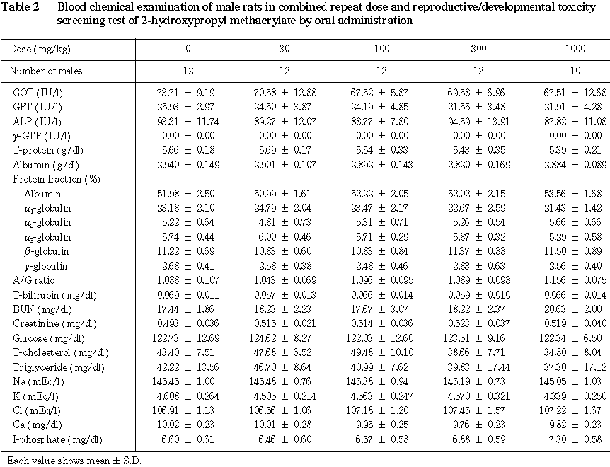 ͺưʪ¤ËÂФ·¤Æ¤Ï¡¤ 1000 mg/kg·²¤Ç2Î㤬»àË´¤·¤¿¡¥»àË´Îã¤Î˶¸¡¡¤°Û¾ï¤Î´Ñ»¡¤µ¤ì¤¿´ï´±¡¦ÁÈ¿¥¤ÎÉÂÍýÁÈ¿¥³ØÅª¸¡ºº¤Ë¤ª¤¤¤Æ¡¤¾Ã²½´É¤ÎÊѲ½¤¢¤ë¤¤¤Ï»à¸åÊѲ½¤Ë´ð¤Å¤¯¤È¹Í¤¨¤é¤ì¤ë½ê¸«¤Î¾¤Ë¤Ï¡¤ÆÃÉ®¤¹¤Ù¤ÊѲ½¤Ïǧ¤á¤é¤ì¤º¡¤»à°ø¤ÏÌÀ¤é¤«¤Ë¤Ç¤¤Ê¤«¤Ã¤¿¡¥°ìÈ̾õÂÖ´Ñ»¡¤Ë¤ª¤¤¤Æ¡¤1000 mg/kg·²¤Ç¤ÏÅêÍ¿´ü´Ö¤Î½é´ü¤«¤éή޷¤¬¤ß¤é¤ì¤¿¡¥¤Þ¤¿¡¤ÅêÍ¿´ü´Ö¤ÎÃæ´ü¤«¤é¼«È¯±¿Æ°¤ÎÄã²¼¡¤´ãâÛ²¼¿â¤¬¤ß¤é¤ì¤¿¡¥300 mg/kg°Ê²¼¤Î·²¤Ç¤Ï¡¤»à˴ȯ¸½¤Ï¤Ê¤¯¡¤°ìÈ̾õÂ֤ΰ۾ï¤â¤ß¤é¤ì¤Ê¤«¤Ã¤¿¡¥ÂνŤª¤è¤ÓÀݱÂÎ̤ˤϡ¤1000 mg/kg¤ÎÅêÍ¿¤Ç¤â±Æ¶Á¤Ï¤ß¤é¤ì¤Ê¤«¤Ã¤¿¡¥1000 mg/kg·²¤Ç´Ñ»¡¤µ¤ì¤¿Î®Þ·¤Ï¡¤¥á¥¿¥¯¥ê¥ë»À(2-¥Ò¥É¥í¥¥·¥×¥í¥Ô¥ë)¥¨¥¹¥Æ¥ë¤Î»É·ãÀ¤Ë´ð¤Å¤¯ÊѲ½¤È¹Í¤¨¤é¤ì¤ë¡¥¤Þ¤¿¡¤¼«È¯±¿Æ°¤ÎÄã²¼¤ª¤è¤Ó´ãâÛ²¼¿â¤Ï¡¤¥á¥¿¥¯¥ê¥ë»À(2-¥Ò¥É¥í¥¥·¥×¥í¥Ô¥ë)¥¨¥¹¥Æ¥ë¤ÎÂçÎÌÅêÍ¿¤Ë¤è¤ëÆÇÀ³ØÅªÊѲ½¤È¹Í¤¨¤é¤ì¤ë¤¬¡¤Âνſä°Ü¤ª¤è¤ÓÀݱÂÎ̤˱ƶÁ¤òµÚ¤Ü¤¹¤Û¤É¤Î¤â¤Î¤Ç¤Ï¤Ê¤«¤Ã¤¿¡¥1000 mg/kg·²¤Ç´Î¡¤ÎÁêÂнÅÎ̤ÎͰդʹâÃͤ¬¤ß¤é¤ì¤¿¡¥¤·¤«¤·¡¤´Î¡¤ÎÀäÂнÅÎ̤ˤϺ¹¤¬Ç§¤á¤é¤ì¤Ê¤¤¤³¤È¡¤·ì±ÕÀ¸²½³Ø¸¡ºº¤Ç¤â´ØÏ¢¹àÌܤ˰۾郎¤ß¤é¤ì¤Ê¤¤¤³¤È¡¤¤µ¤é¤Ë´Î¡¤ÎÉÂÍýÁÈ¿¥³ØÅª¸¡ºº¤Ç¤â°Û¾ï¤¬¤ß¤é¤ì¤Ê¤¤¤³¤È¤«¤é¡¤´Î¡¤ÎÁêÂнÅÎ̤ÎÊÑÆ°¤¬¥á¥¿¥¯¥ê¥ë»À(2-¥Ò¥É¥í¥¥·¥×¥í¥Ô¥ë)¥¨¥¹¥Æ¥ë¤ÎÅêÍ¿¤Ë¤è¤ë¤â¤Î¤È¤·¤Æ¤âÆÇÀ³ØÅª¤Ë½ÅÆÆ¤Ê¤â¤Î¤Ç¤Ï¤Ê¤¤¤È¹Í¤¨¤é¤ì¤ë¡¥·ì±Õ³Ø¸¡ºº¤Ë¤ª¤¤¤Æ¡¤1000 mg/kg·²¤Ç¥Ø¥Þ¥È¥¯¥ê¥Ã¥ÈÃͤÎÄãÃÍ¡¤ÀÖ·ìµå¿ô¤ª¤è¤Ó¥Ø¥â¥°¥í¥Ó¥óÎ̤ÎÄãÃÍ·¹¸þ¤¬¤ß¤é¤ì¤¿¤¬¡¤Â¾¤Î¹àÌܤ˰۾郎ǧ¤á¤é¤ì¤Ê¤¤¤³¤È¤«¤é¡¤¥á¥¿¥¯¥ê¥ë»À(2-¥Ò¥É¥í¥¥·¥×¥í¥Ô¥ë)¥¨¥¹¥Æ¥ë¤ÎÅêÍ¿¤Ë¤è¤ë¤â¤Î¤È¤·¤Æ¤â½ÅÆÆ¤Ê±Æ¶Á¤È¤Ï¹Í¤¨¤é¤ì¤Ê¤¤¡¥Ë¶¸¡¤Ë¤ª¤¤¤Æ¡¤¿Õâ³³ÈÄ¥¡¤ÀºÁã¾åÂΤÎÈøÉô¤Ë²«Çò¿§·ëÀᡤÀºÁ㤪¤è¤ÓÀºÁã¾åÂΤΰà½Ì¤¬¤ß¤é¤ì¤¿¤¬¡¤¤¤¤º¤ì¤â¾¯¿ôÎã¤Ç¤¢¤ê¡¤¤«¤Ä¡¤ºÇ¹âÍÑÎÌ·²¤Ç¤Ïǧ¤á¤é¤ì¤Ê¤¤¤³¤È¤«¤é¡¤¥á¥¿¥¯¥ê¥ë»À(2-¥Ò¥É¥í¥¥·¥×¥í¥Ô¥ë)¥¨¥¹¥Æ¥ë¤ÎÅêÍ¿¤Ë¤è¤ë¤â¤Î¤Ç¤Ï¤Ê¤¤¤È¹Í¤¨¤é¤ì¤ë¡¥ÉÂÍýÁÈ¿¥³ØÅª¸¡ºº¤Ë¤ª¤¤¤Æ¡¤1000 mg/kg·²¤Ç¤â¥á¥¿¥¯¥ê¥ë»À(2-¥Ò¥É¥í¥¥·¥×¥í¥Ô¥ë)¥¨¥¹¥Æ¥ë¤ÎÅêÍ¿¤Ëµ¯°ø¤¹¤ë¤È»×¤ï¤ì¤ëÊѲ½¤Ï¤ß¤é¤ì¤Ê¤«¤Ã¤¿¡¥