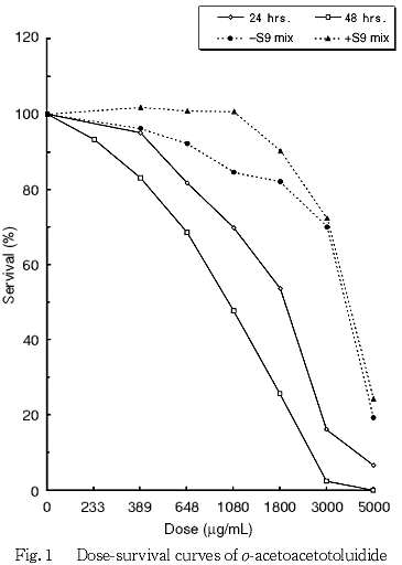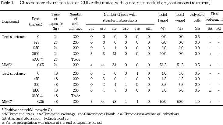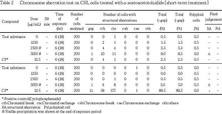 以上の結果より,本試験条件下ではo-アセトアセトトルイジドは,染色体異常を誘発する(陽性)と結論した.