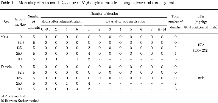 N-フェニルマレイミドのLD50値は,雄が153 mg/kg(95 %信頼限界:100〜237 mg/kg),雌が188 mg/kgであった.