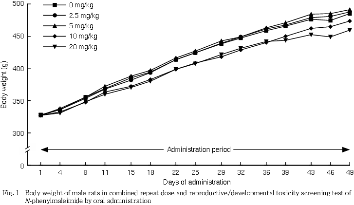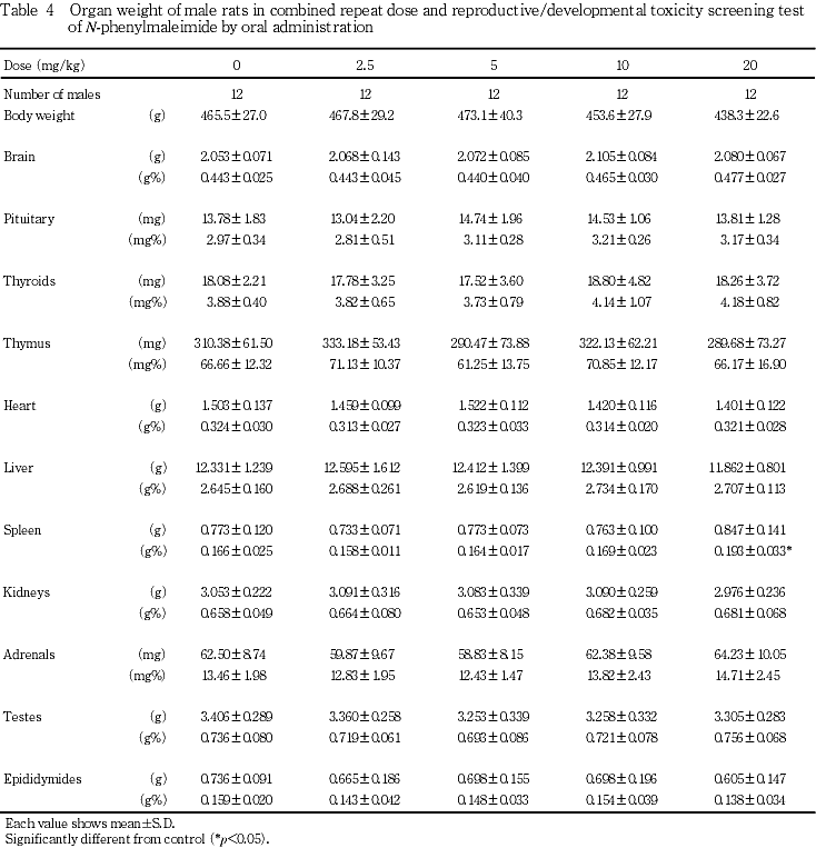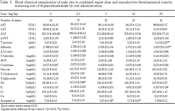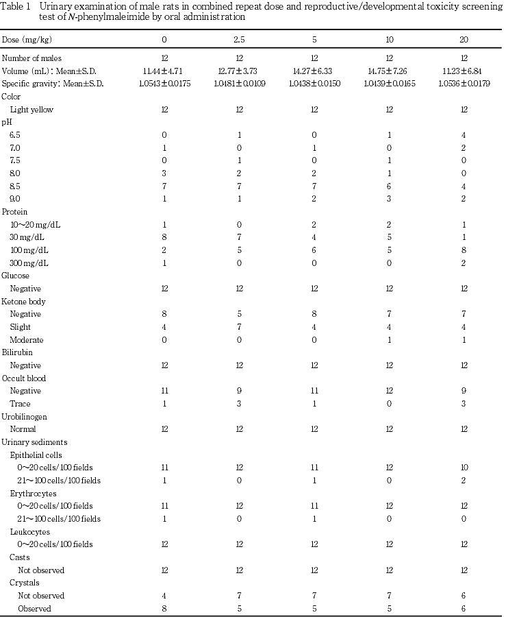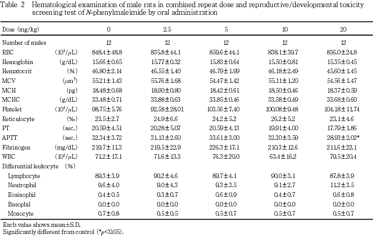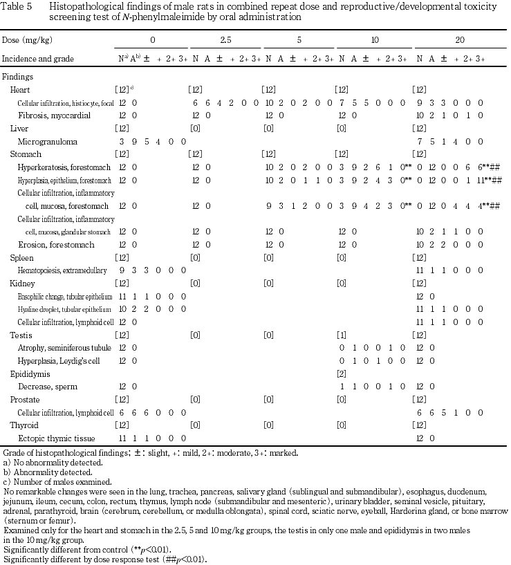 雄に関しては,死亡および瀕死例はいずれの群にも認められなかった.一般状態では,20 mg/kg群で被毛の汚れが1例認められたが,一過性のものであることから,軽微な変化と考えられる.なお,5,10および20 mg/kg群で投与後に一過性の流涎がみられたが,被験物質の刺激性に基づくものと判断され,毒性症状とはみなさなかった.体重において,20 mg/kg群でほぼ投与期間を通して低値傾向がみられた.また,摂餌量においては,10および20 mg/kg群で投与13日に一過性の低値がみられた.投与期間終了前の尿検査において異常はみられなかった.投与期間終了時の血液学検査において20 mg/kg群でPTおよびAPTTの低値あるいは低値傾向,血液生化学検査において20 mg/kg群で総蛋白およびアルブミン量の低値がみられた.剖検では,5 mg/kg群で前胃粘膜の潰瘍および浮腫,10 mg/kg群で前胃粘膜の肥厚,20 mg/kg群で前胃粘膜の肥厚と潰瘍がみられた.また,器官重量では,20 mg/kg群で脾臓の絶対および相対重量の高値傾向あるいは高値がみられた.病理組織学検査において,胃では5,10および20 mg/kg群で前胃角化亢進,前胃上皮過形成および前胃粘膜への炎症細胞浸潤,20 mg/kg群ではさらに腺胃粘膜への炎症細胞浸潤および前胃のびらんがみられた.以上のように,N-フェニルマレイミドの一般毒性学的影響としては胃への影響が顕著であった.血液生化学検査において認められた総蛋白およびアルブミン量の低値,器官重量で認められた脾臓の絶対および相対重量の高値あるいは高値傾向は,関連した器官・組織に病理組織学影響はみられなかったことから,軽微な変化と考えられる.