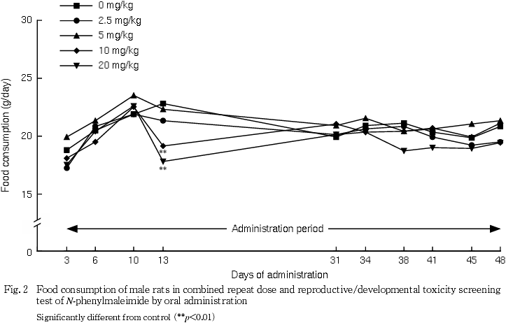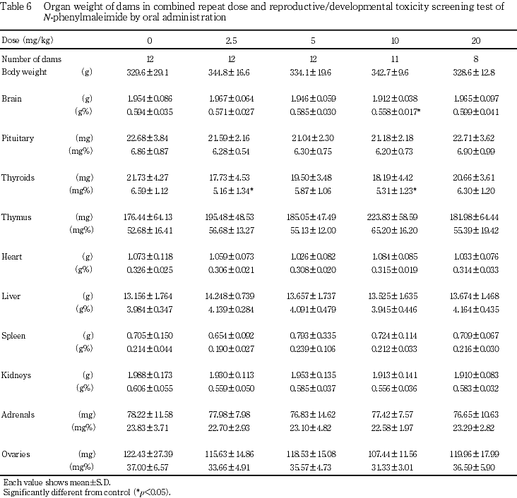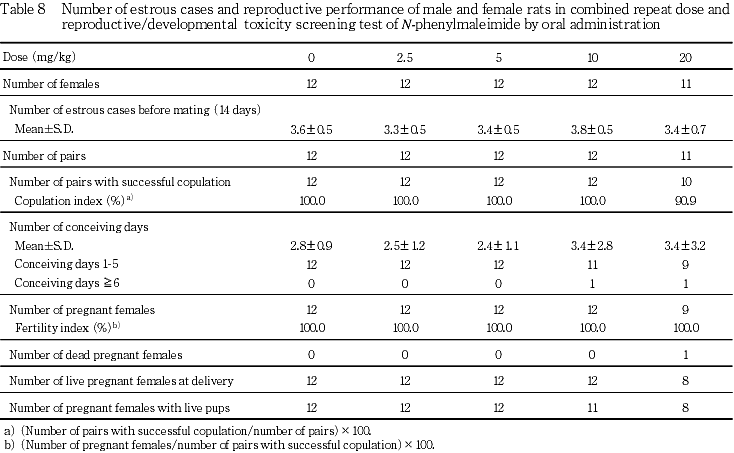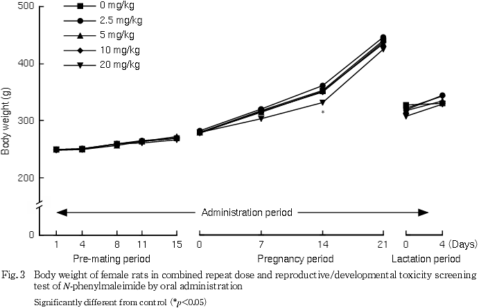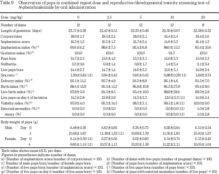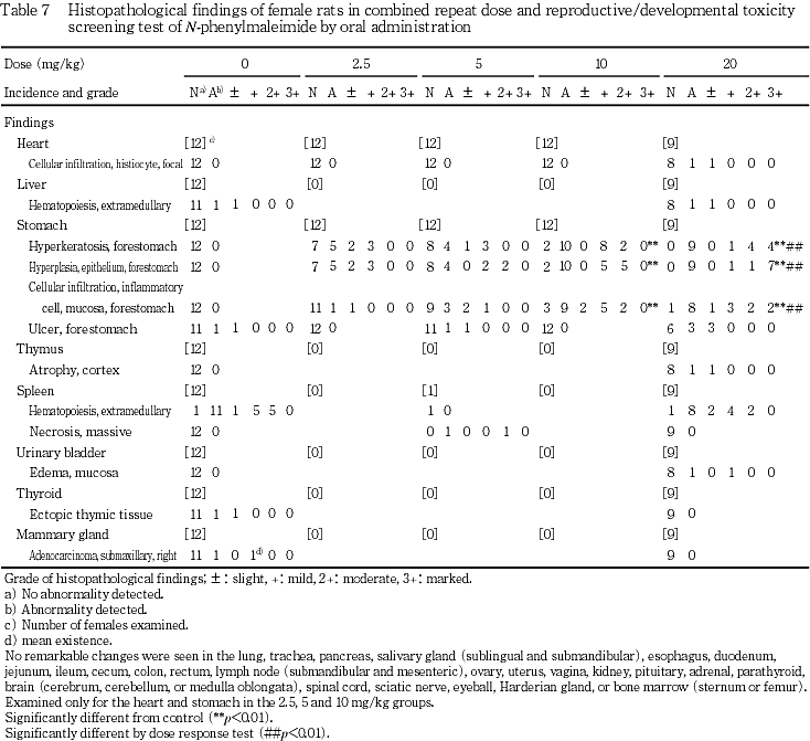雌に関しては,20 mg/kg群で3例が死亡した.なお,20 mg/kg群の死亡例では,各組織に死後変化が認められ,病理組織学的に死因を明らかにできなかったが,剖検において前胃粘膜の潰瘍が1例認められていることから,消化管障害が死因の一部と考えられる.一般状態観察において,雄の場合と同様に5,10および20 mg/kg群で認められた流涎は毒性症状とはみなさなかった.体重において,20 mg/kg群では,妊娠期に一過性の低値がみられた.摂餌量において,20 mg/kg群では,妊娠期に一過性の低値がみられた.剖検において,10および20 mg/kg群で前胃粘膜の肥厚および潰瘍がみられた.しかし,器官重量では,投与に起因する変化はみられなかった.病理組織学検査において,生存例の胃において2.5,5,10および20 mg/kg群では,前胃角化亢進,前胃上皮過形成および前胃粘膜への炎症細胞浸潤がみられた.5および20 mg/kg群では,さらに前胃潰瘍がみられたが,対照群においても1例認められている.以上のように,N-フェニルマレイミドの一般毒性学的影響としては雄の場合と同様に胃への影響が顕著であった.