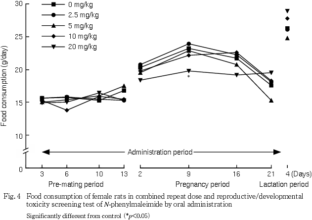 妊娠期間中において,2.5,5および10 mg/kg群では対照群と比べていずれの測定日の摂餌量にも有意差はみられなかった.20 mg/kg群では,対照群と比べて妊娠9日に摂餌量の有意な低値がみられた.