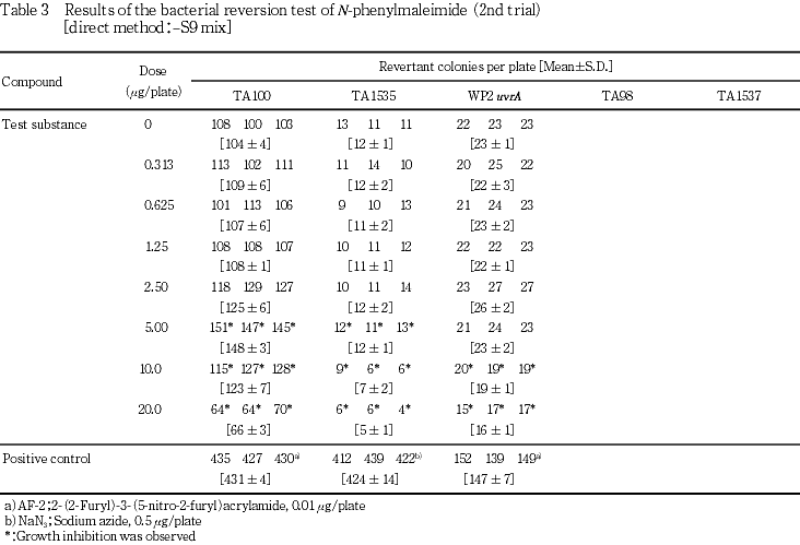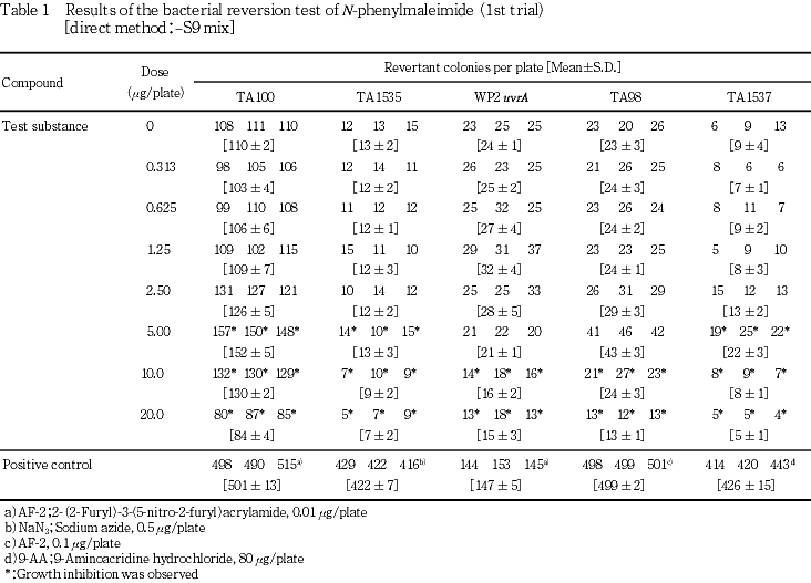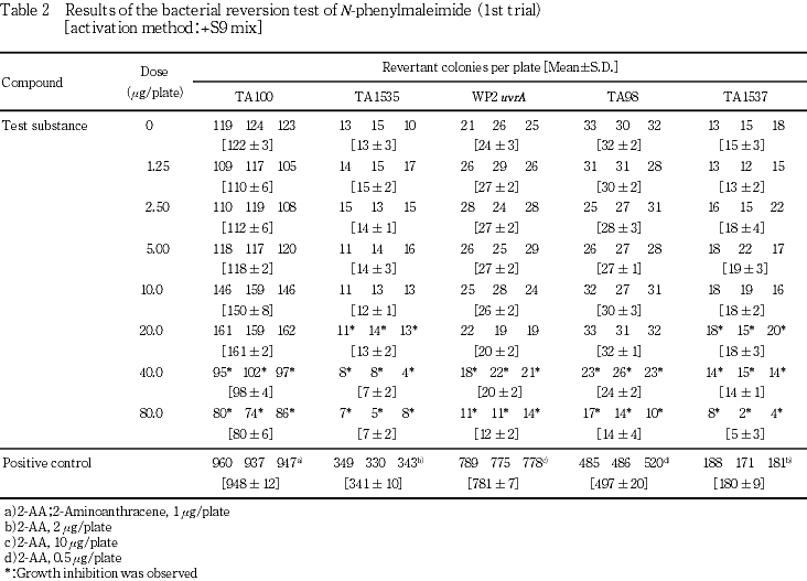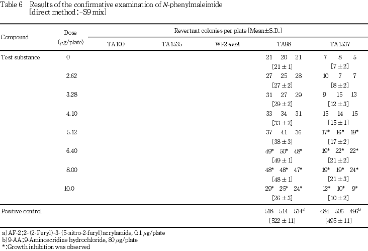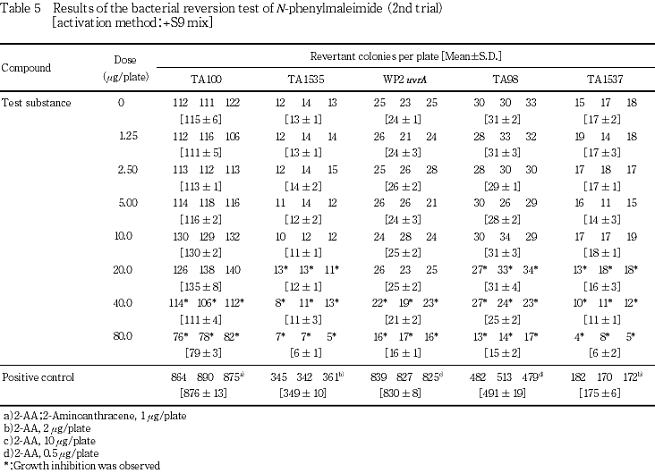 以上の結果より,本試験条件下ではN-フェニルマレイミドは,変異原性を有する(陽性)と結論した.