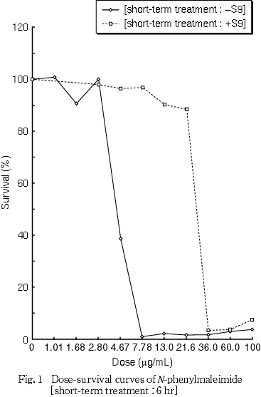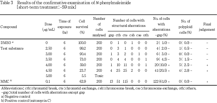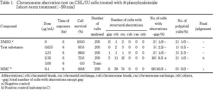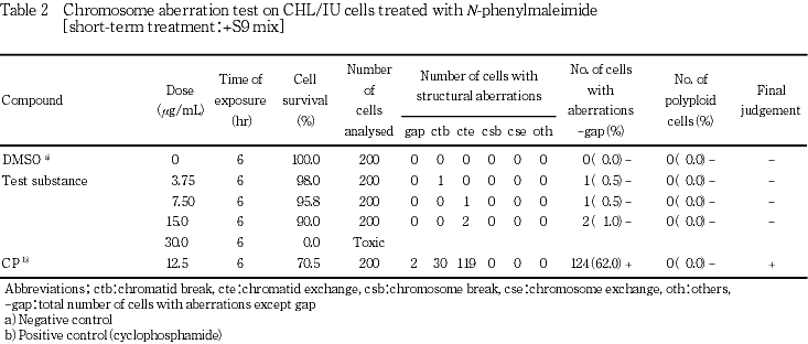 以上の結果より,本試験条件下ではN-フェニルマレイミドは,染色体異常を誘発する(陽性)と結論した.