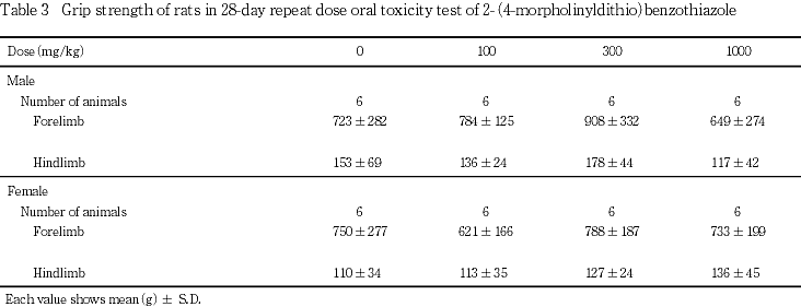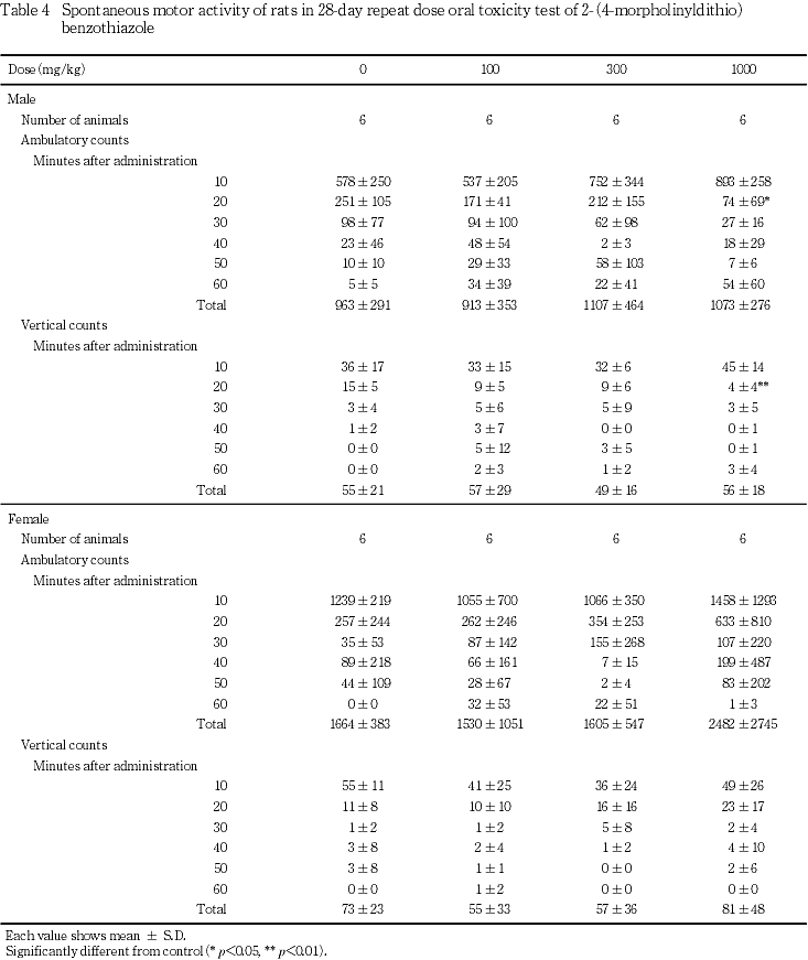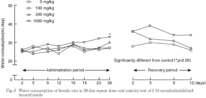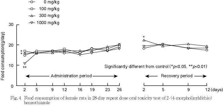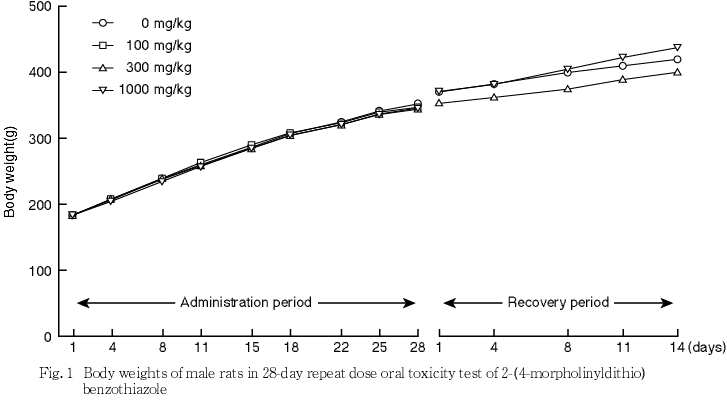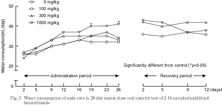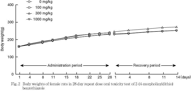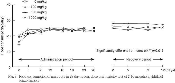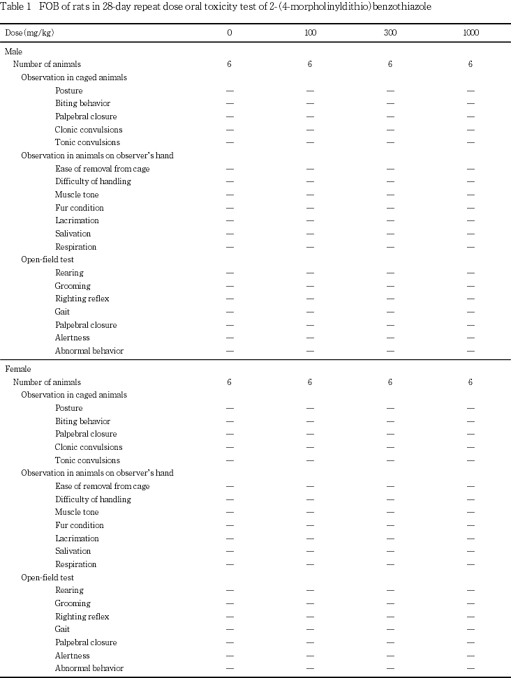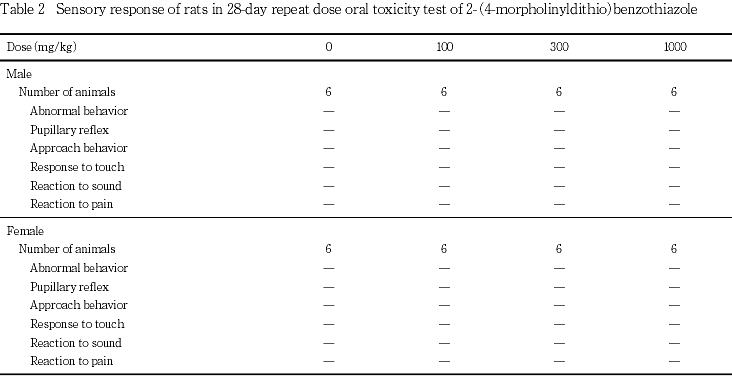 死亡および瀕死例は,いずれの群にも認められなかった.一般状態では,いずれの群にも異常はみられなかった.体重では,投与に起因する変化はみられなかった.摂餌量は,1000 mg/kg群の雌雄で一過性の低値がみられた.また,2-(4-モルホリニルジチオ)ベンゾチアゾールのラットを用いる簡易生殖毒性試験1)においても,1000 mg/kg群の雌雄で摂餌量の低値が認められている.摂水量は,1000 mg/kg群の雌雄で一過性の高値がみられた.